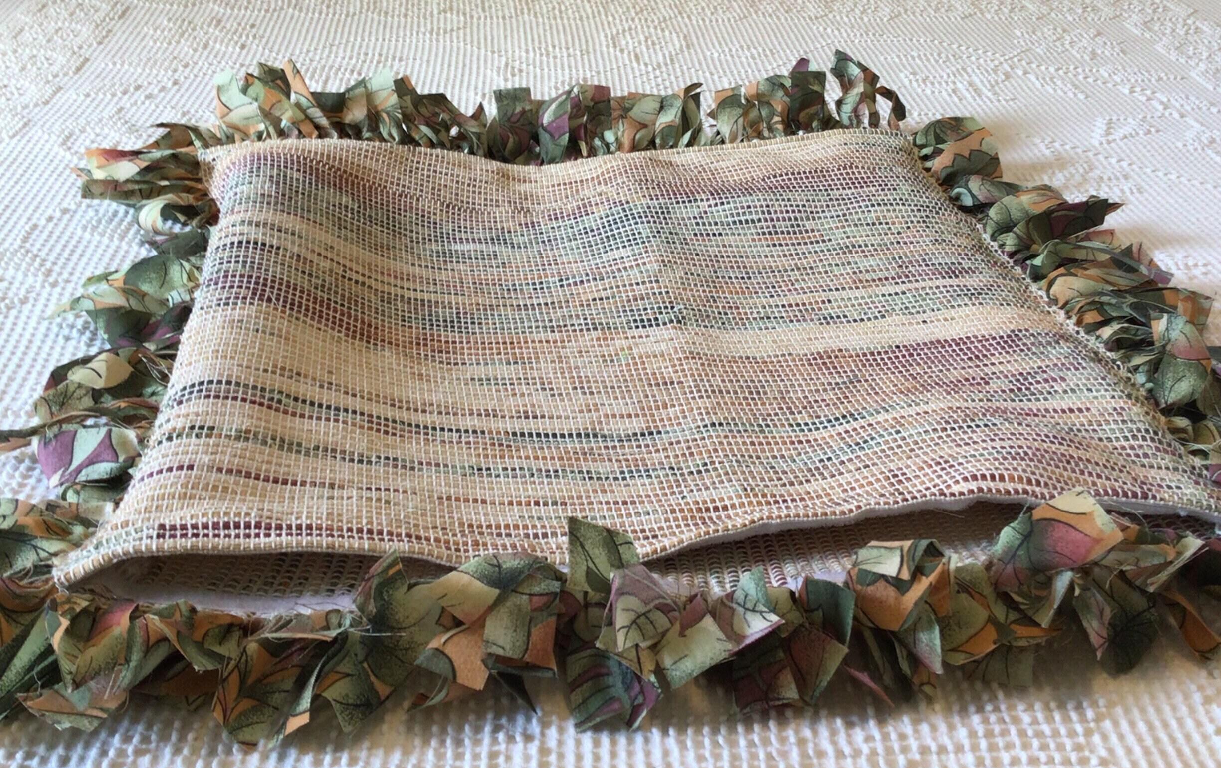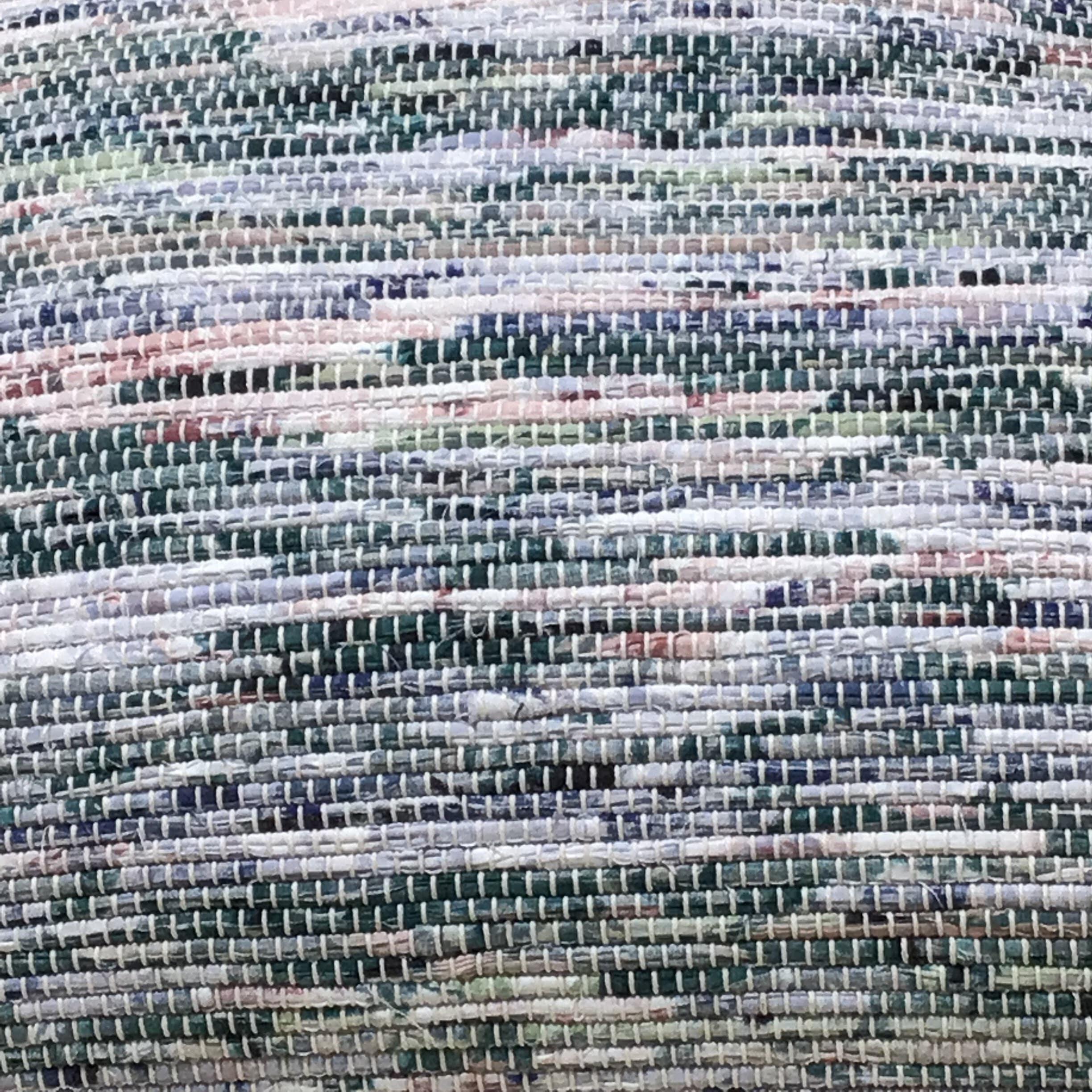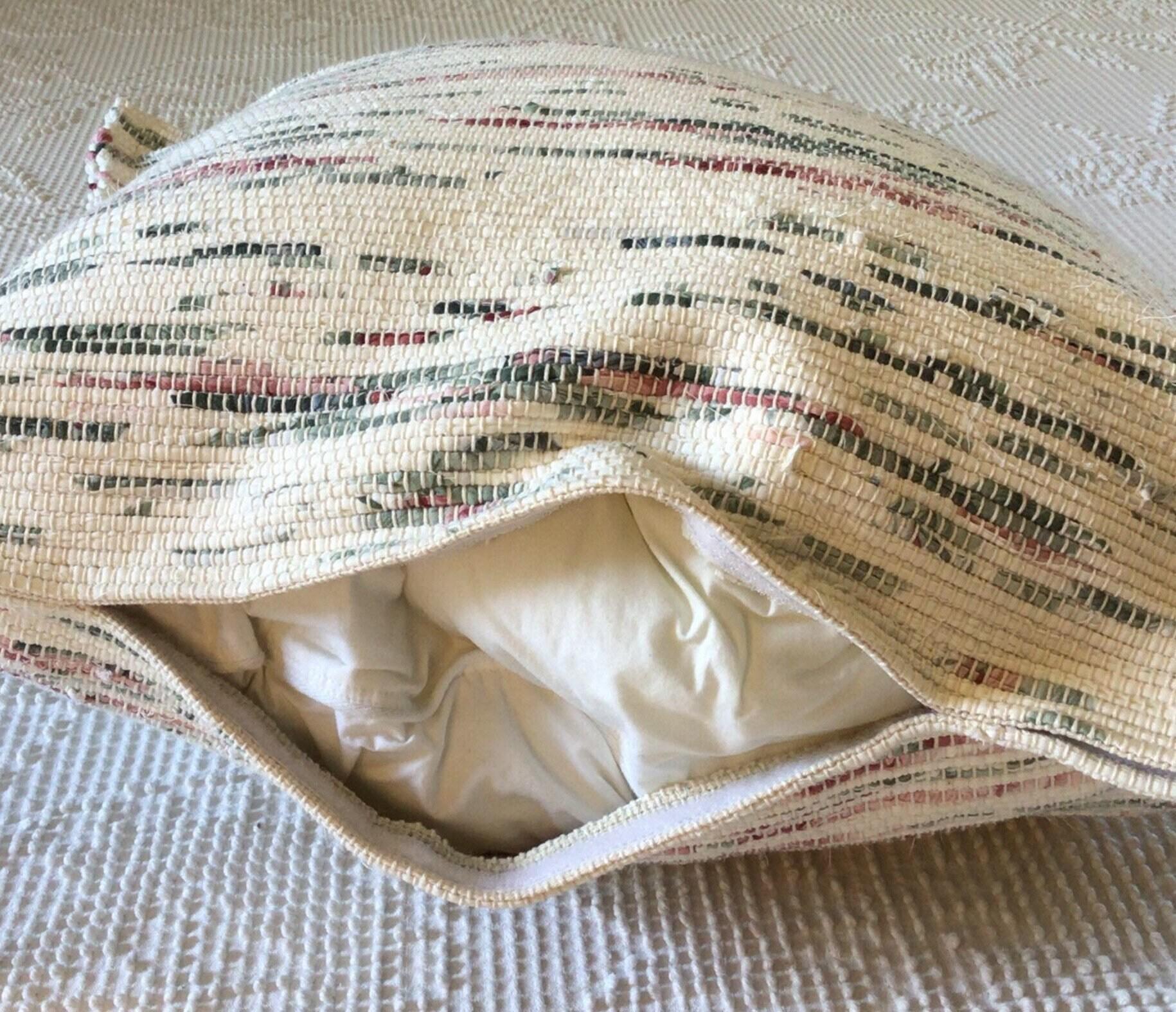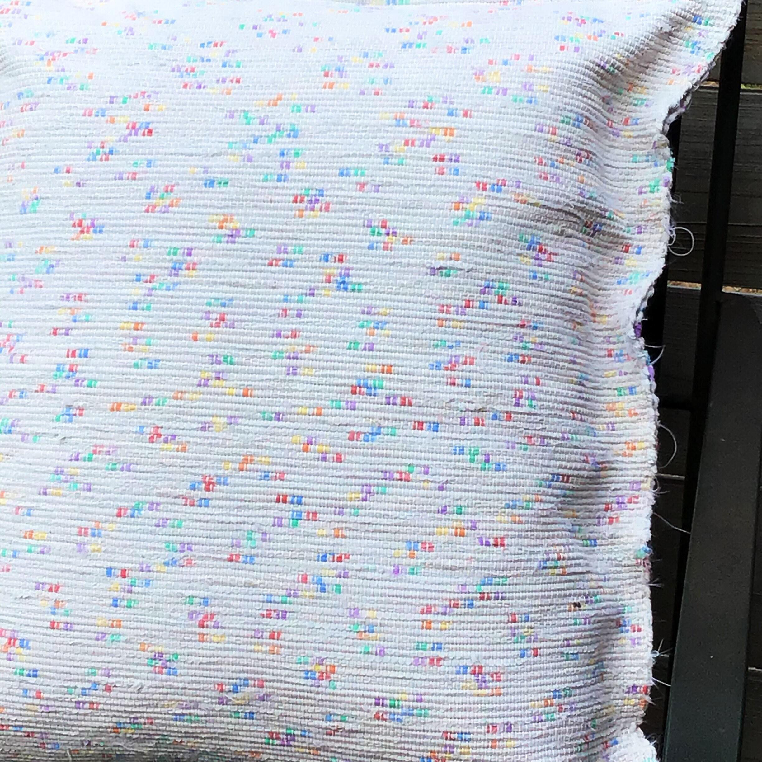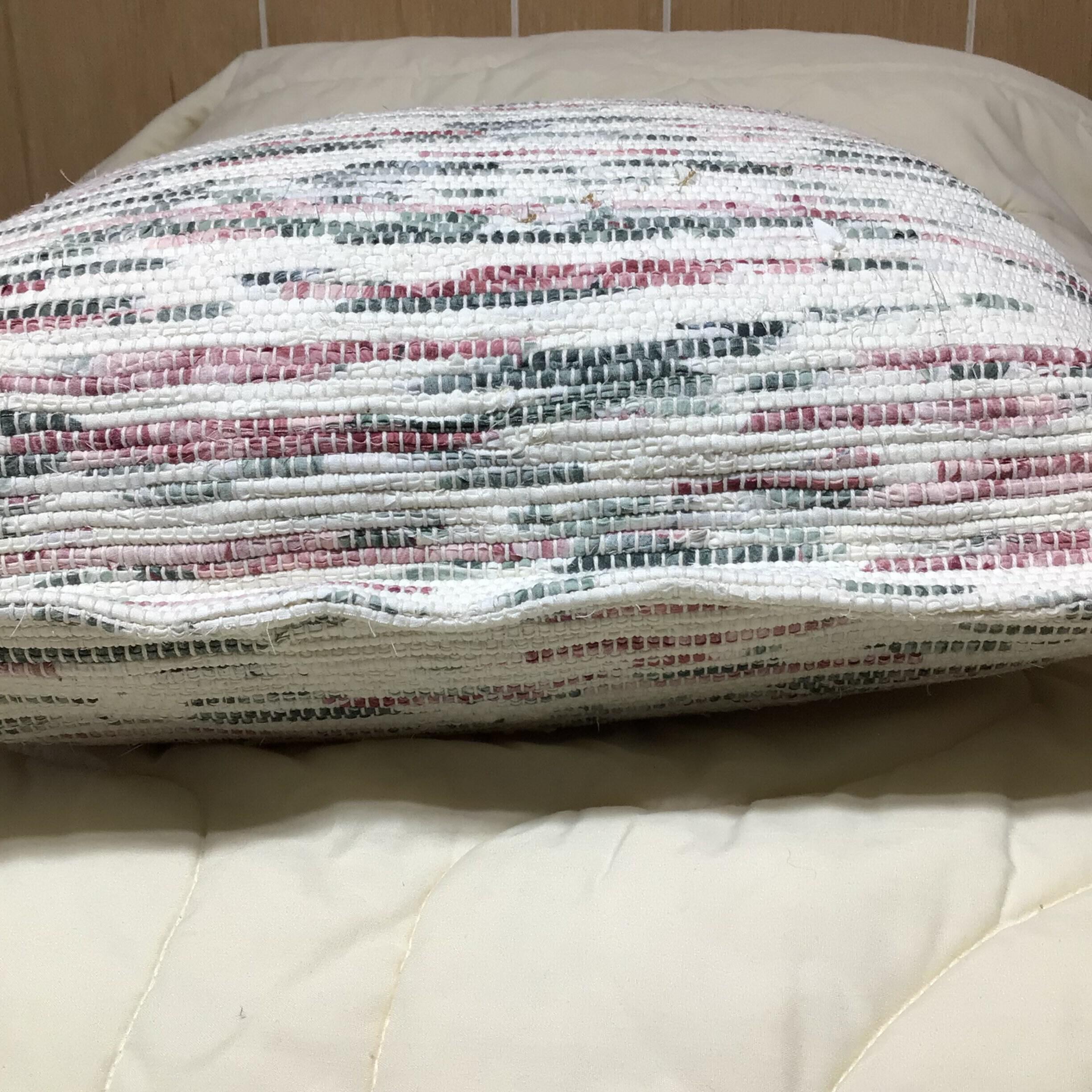 Woven on my 1930’s Union rug loom, this pillow is constructed using the same poly-cotton warp thread I use for rag rugs. The poly-cotton blend is more durable than all cotton. The weft consists of a rescued remnant of fabric from an estate sale. Photo #6 shows this fabric.