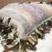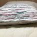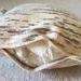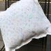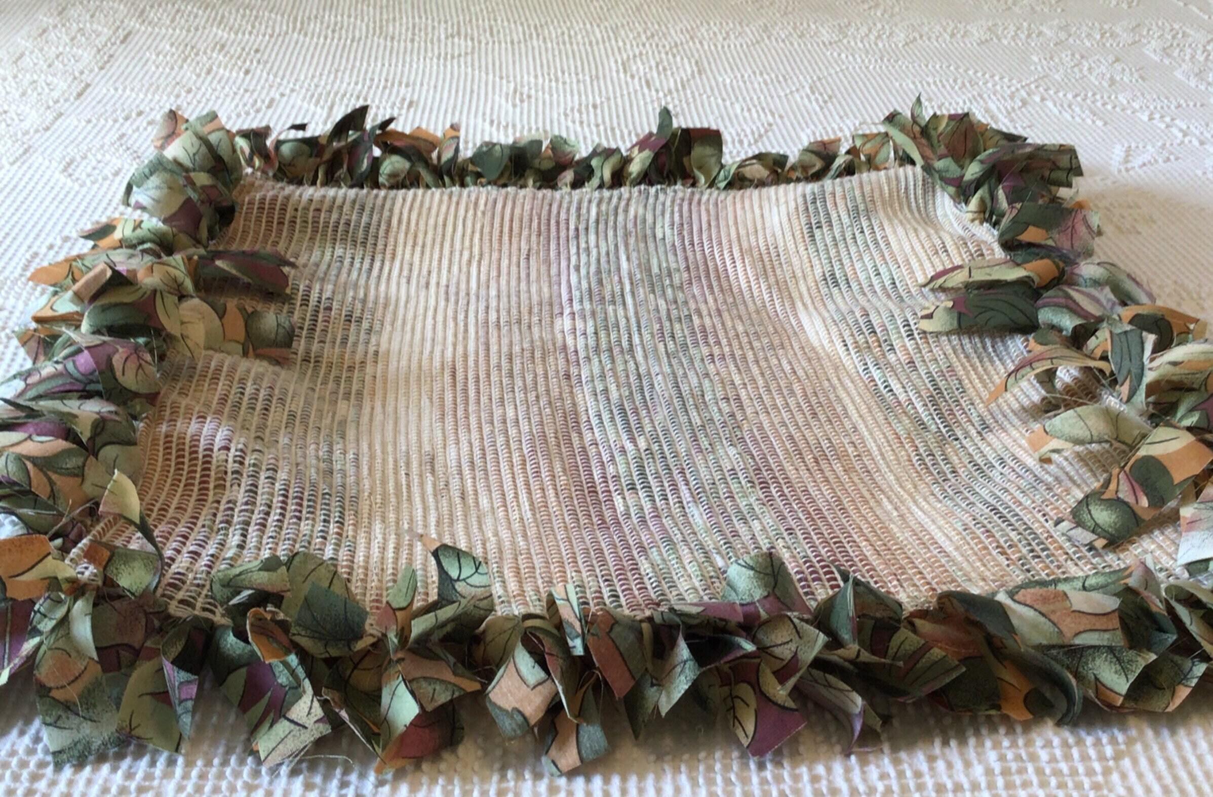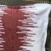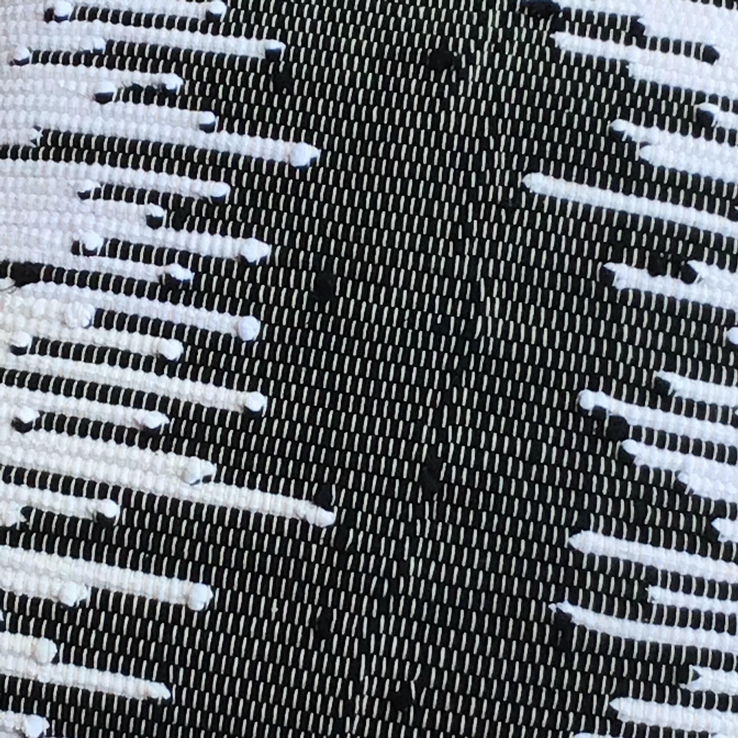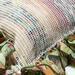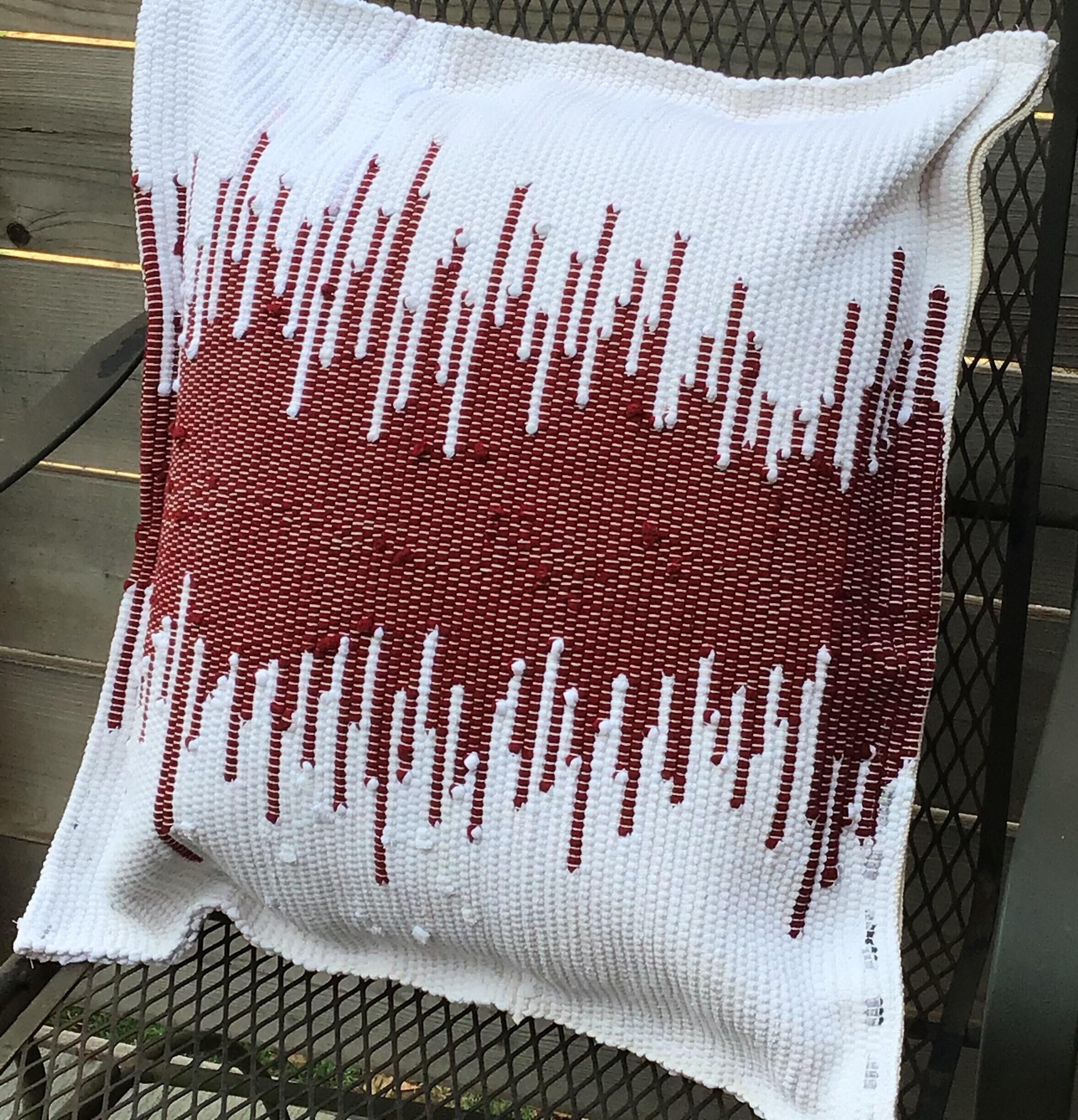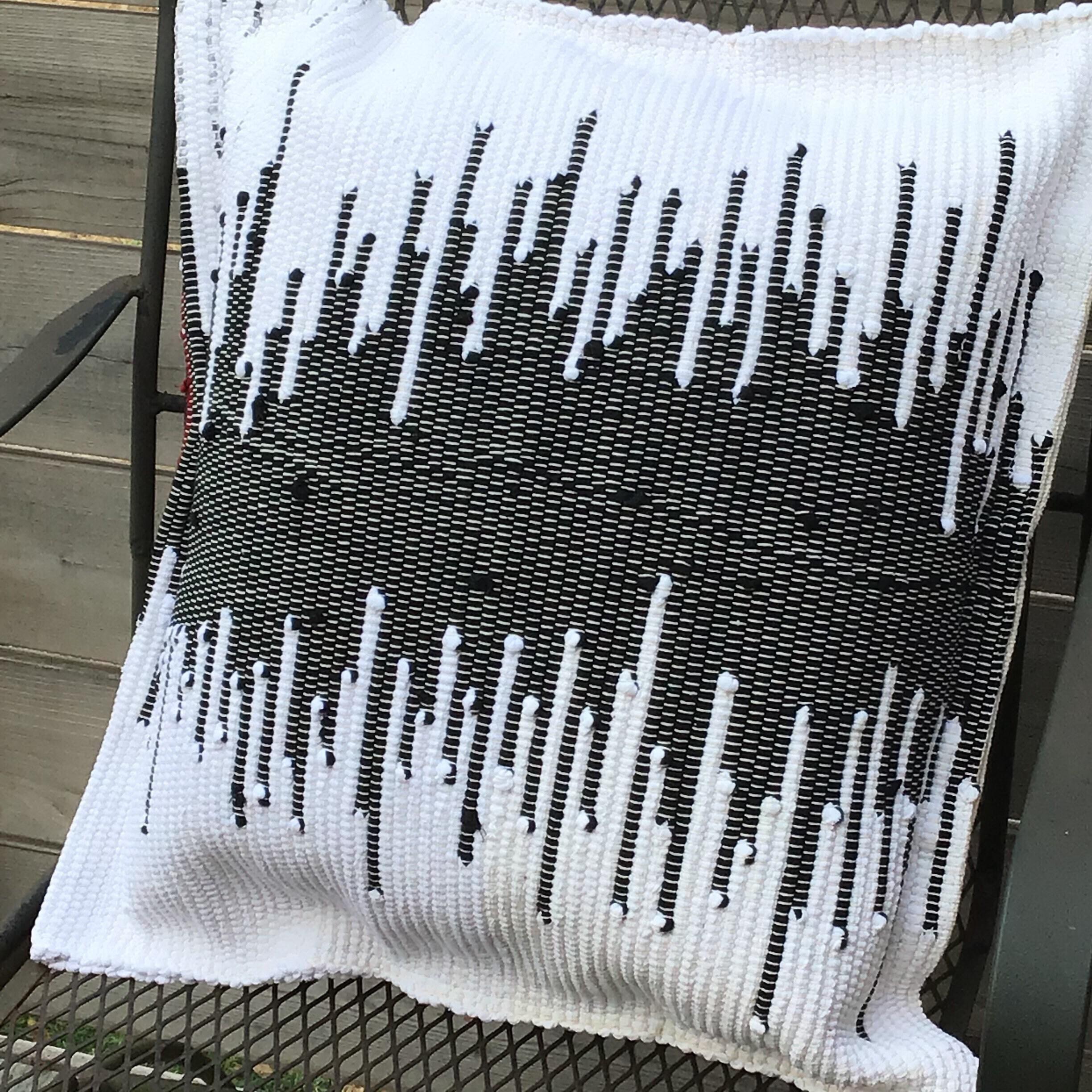 Woven on my 1930’s Union rug loom, this pillow is constructed using the same poly-cotton warp thread I use for rag rugs. The poly-cotton blend is more durable than all cotton. The weft consists of a rescued remnant of fabric from an estate sale. Photo #6 shows this fabric.