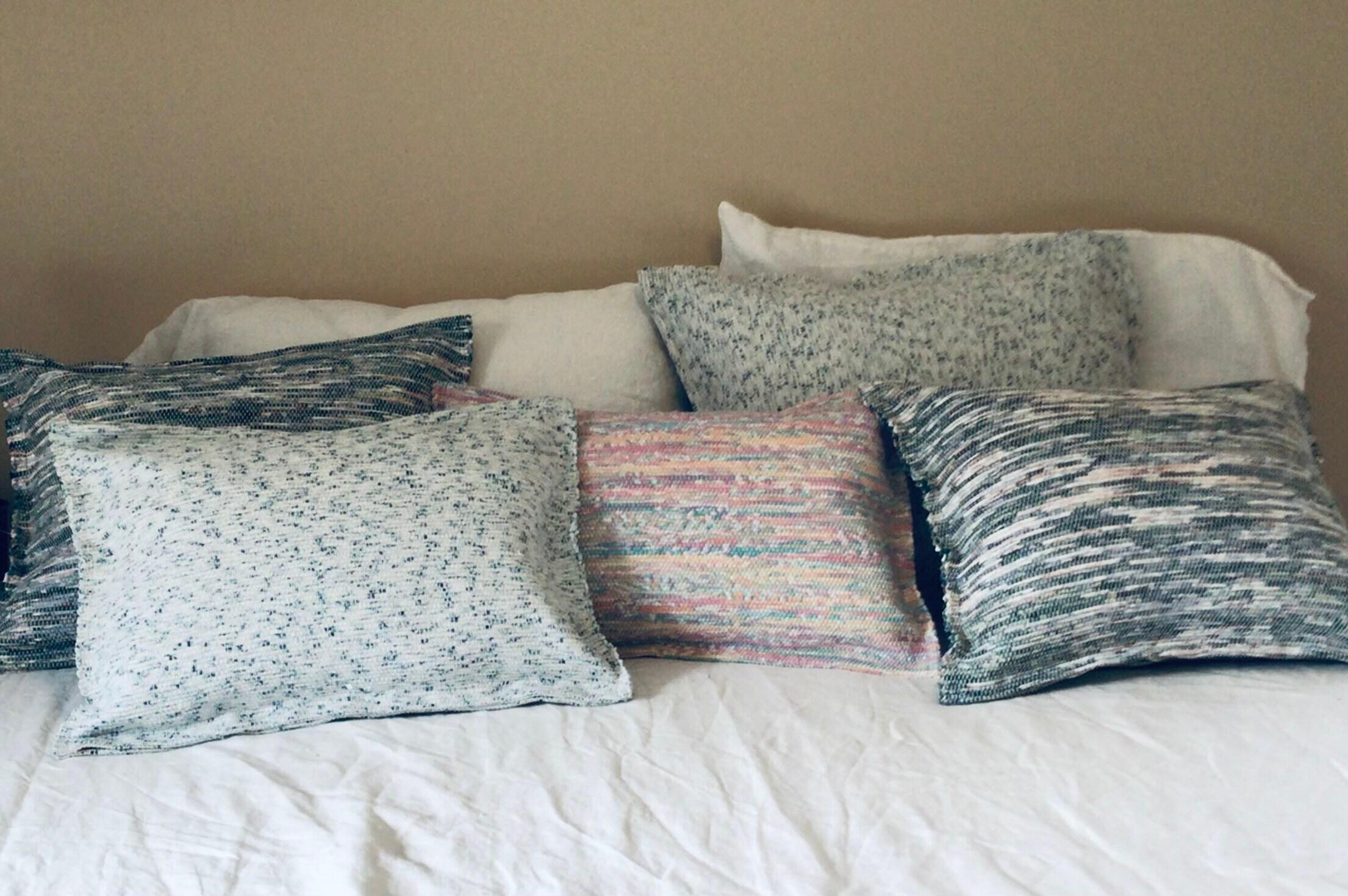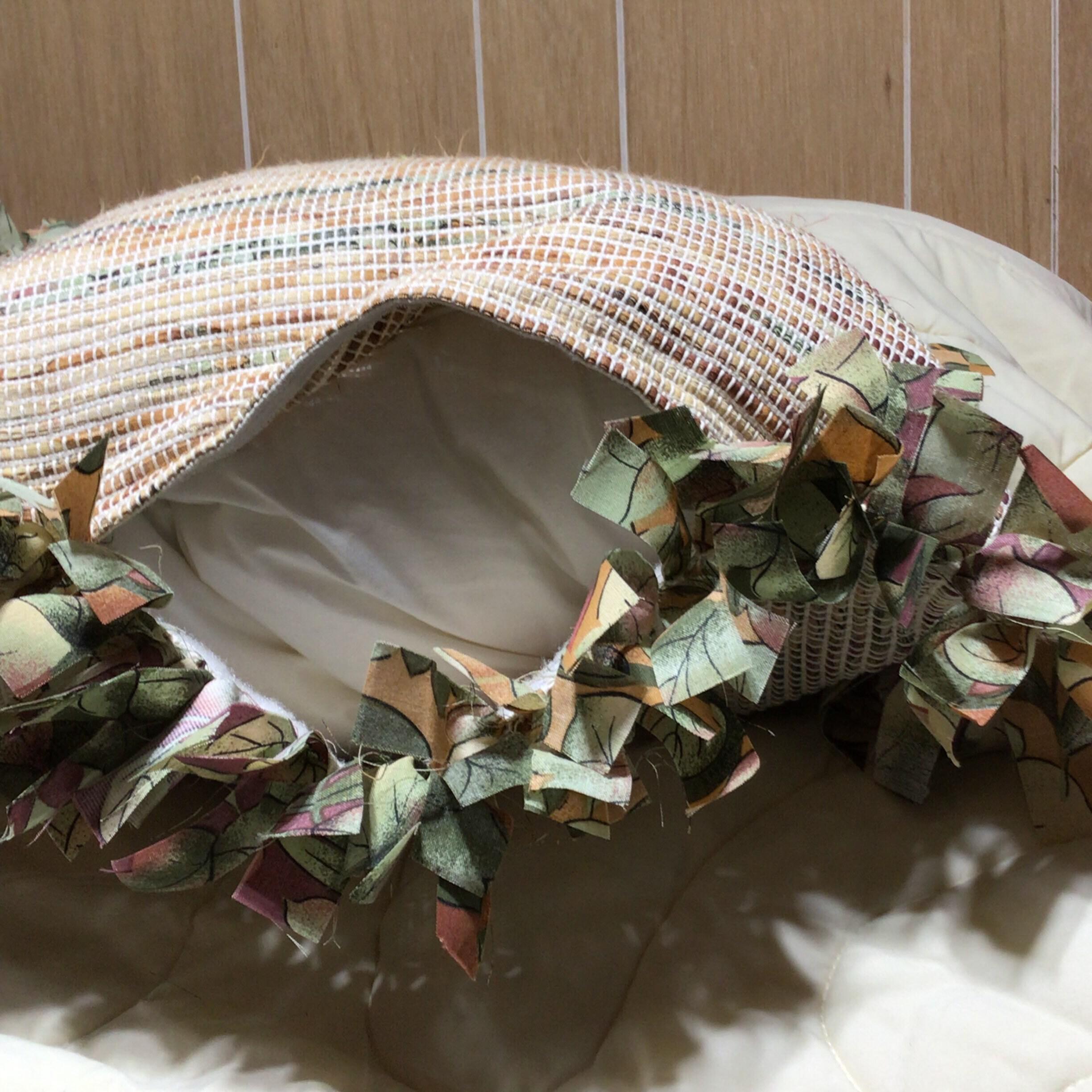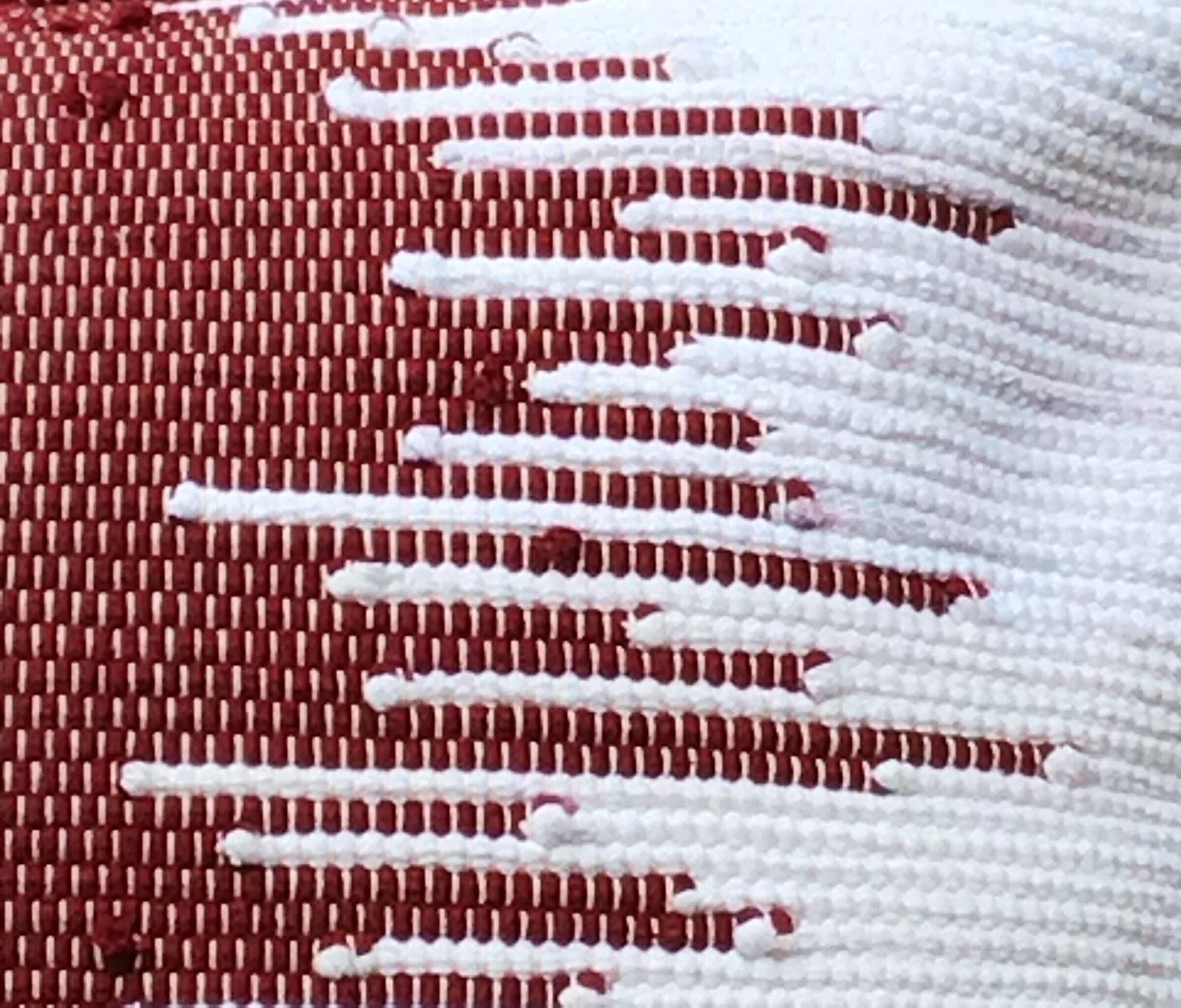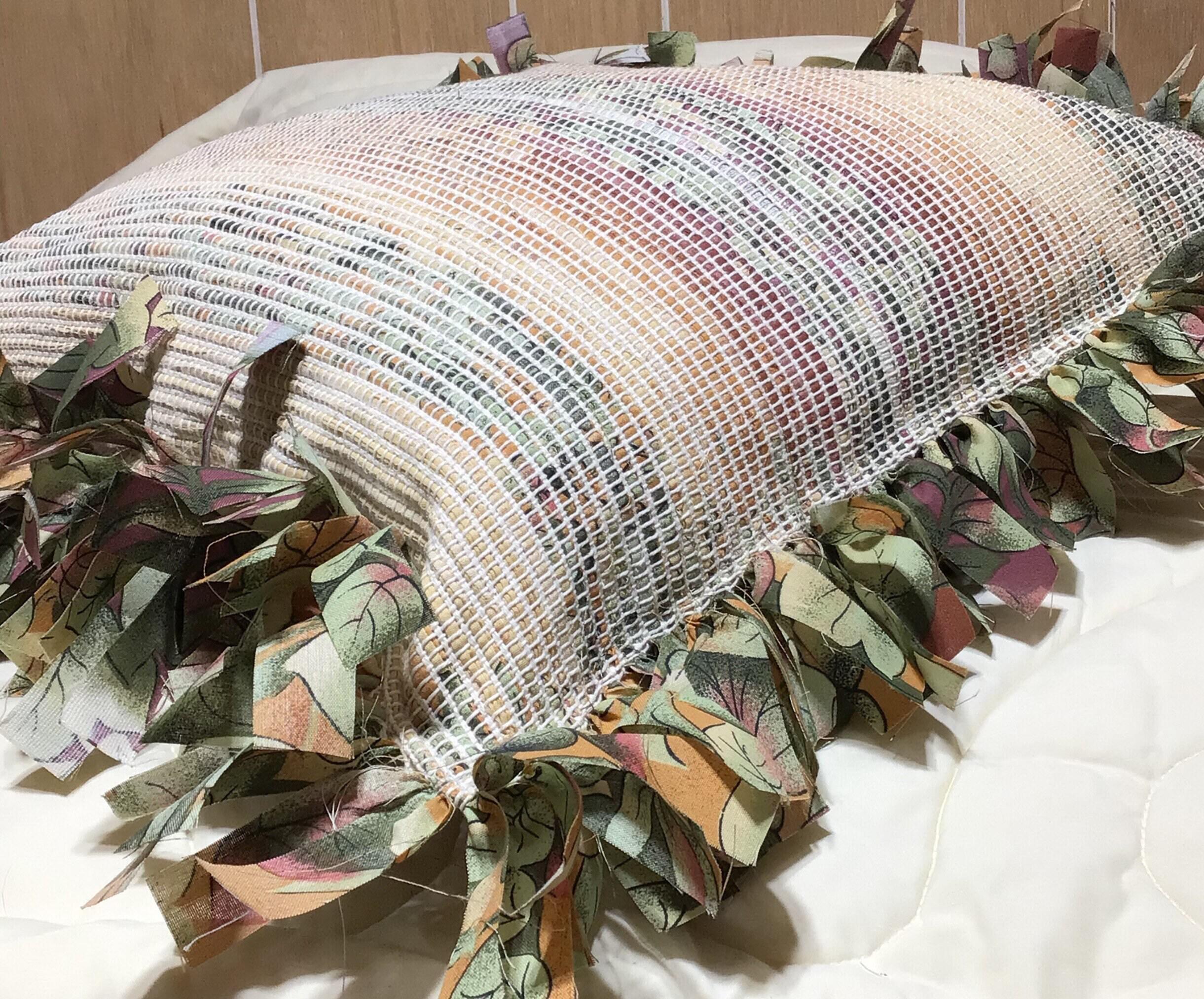 Both sides of the pillow cover are woven and the two sides placed at 90 degree angles so there is fringe on all four sides. To assemble the pillow cover I used hook and loop tape instead of a zipper, due to the thickness of the pillow fabric.