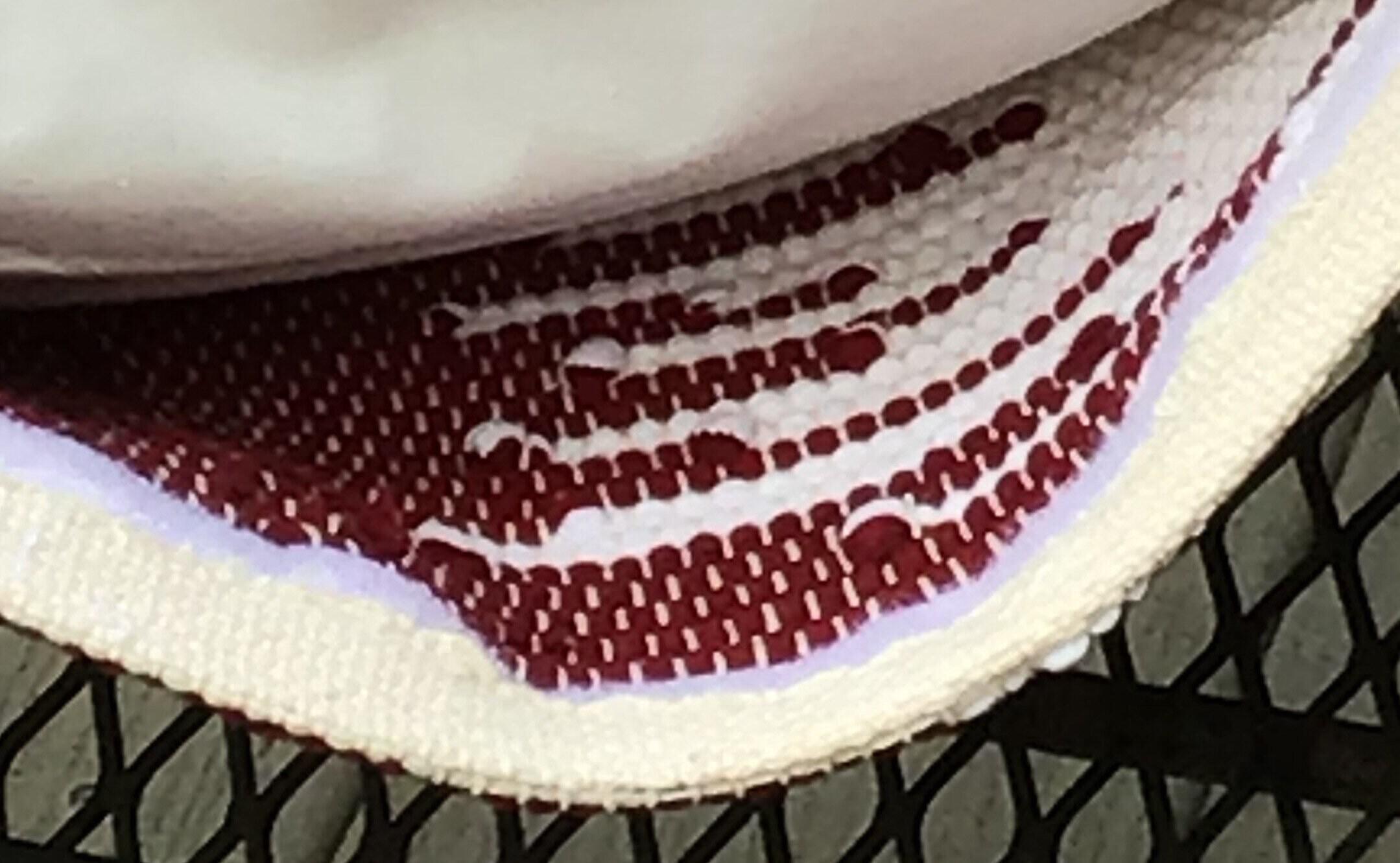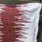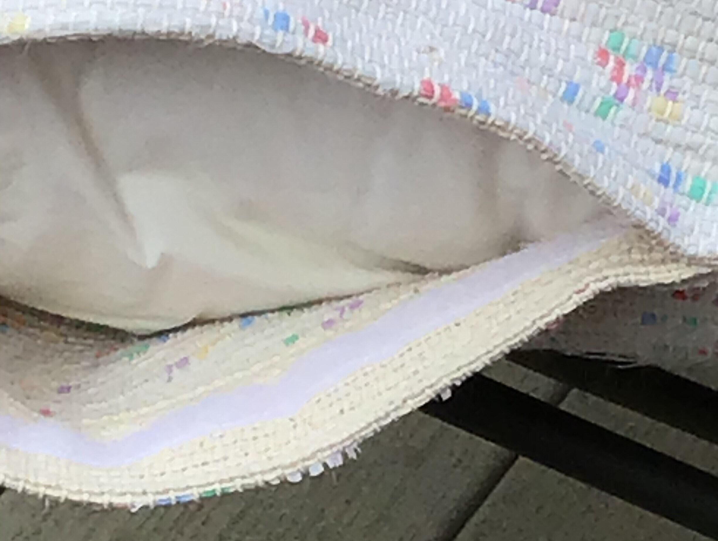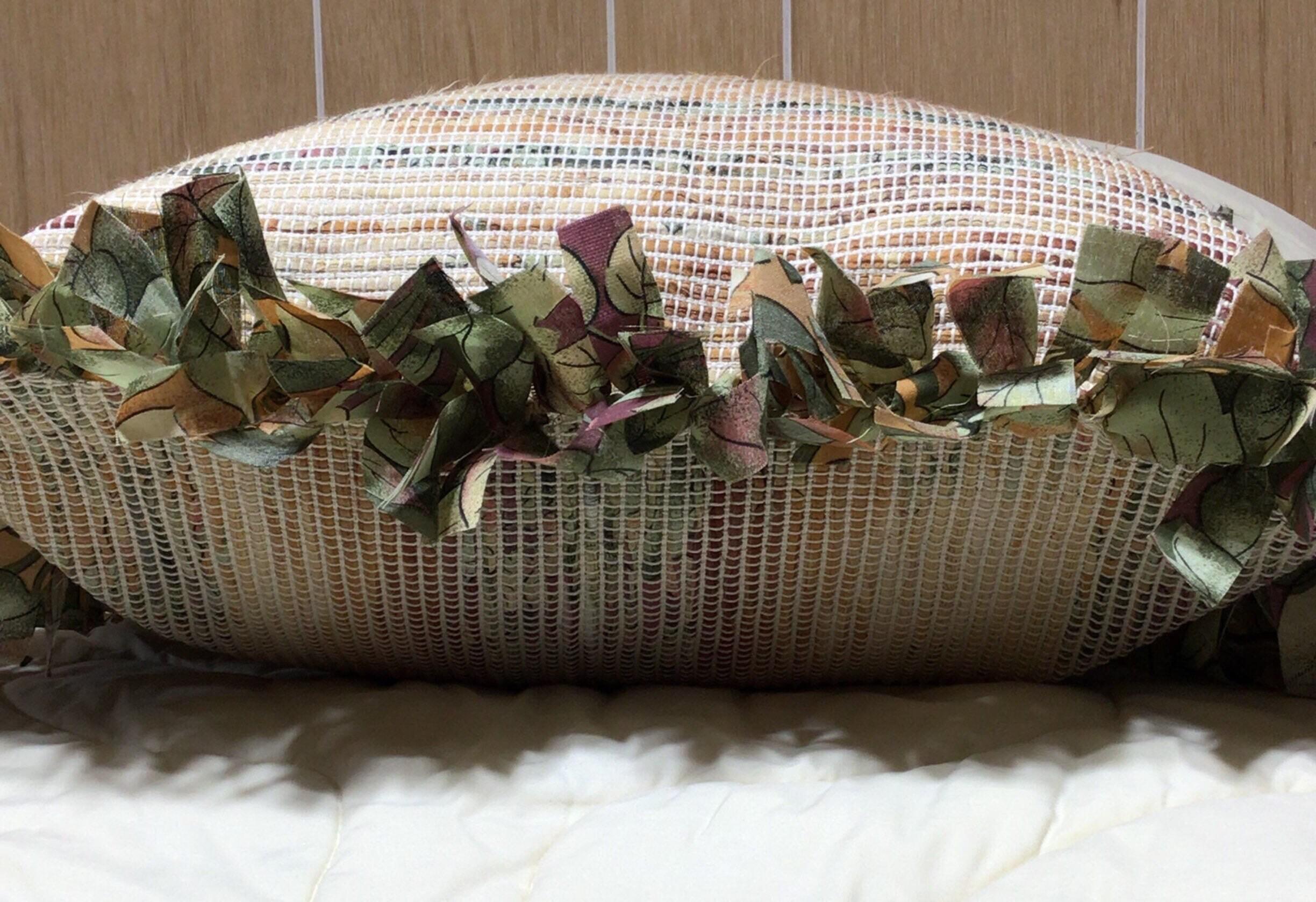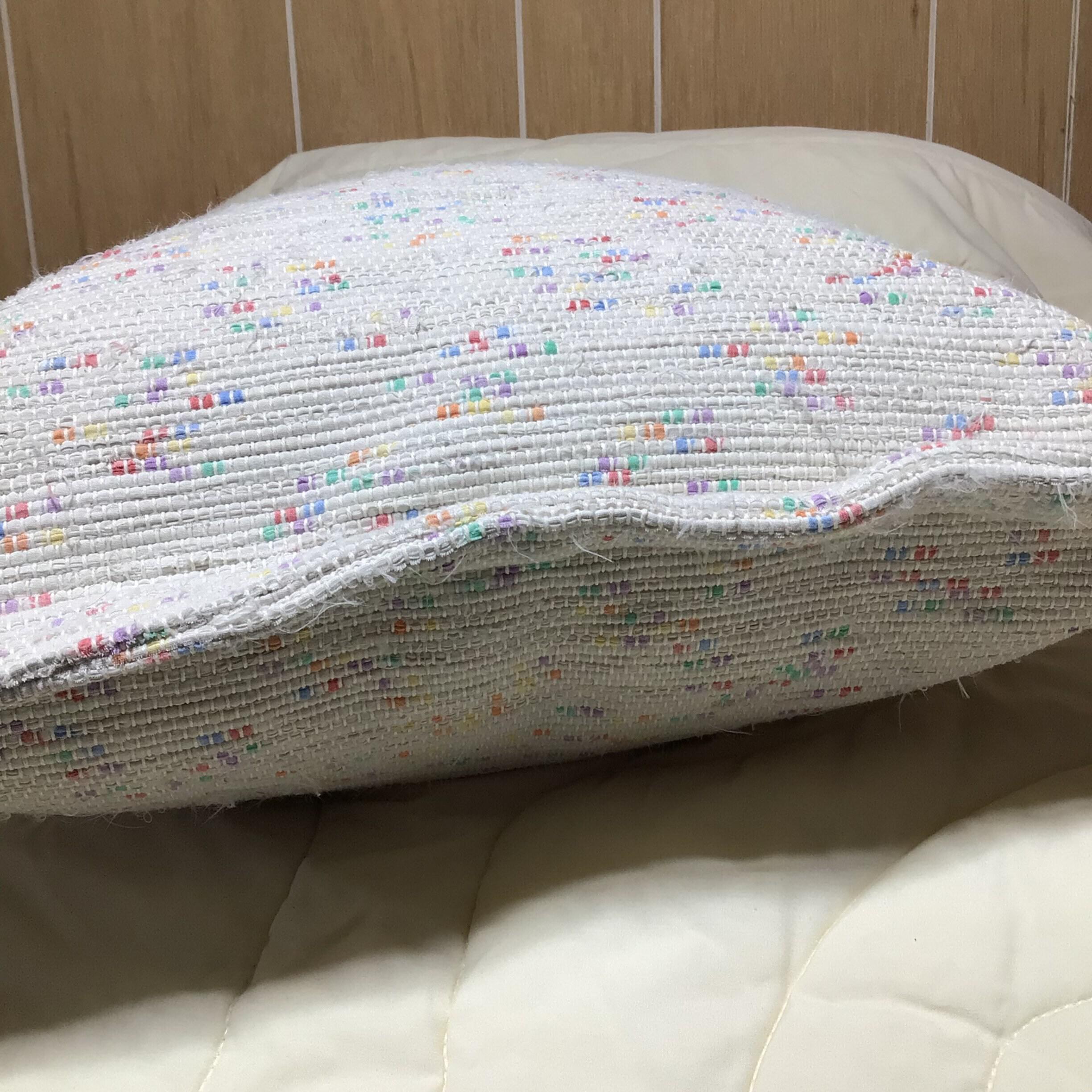 Both sides of the pillow cover are woven and the two sides placed at 90 degree angles so there is fringe on all four sides. To assemble the pillow cover I used hook and loop tape instead of a zipper, due to the thickness of the pillow fabric.
