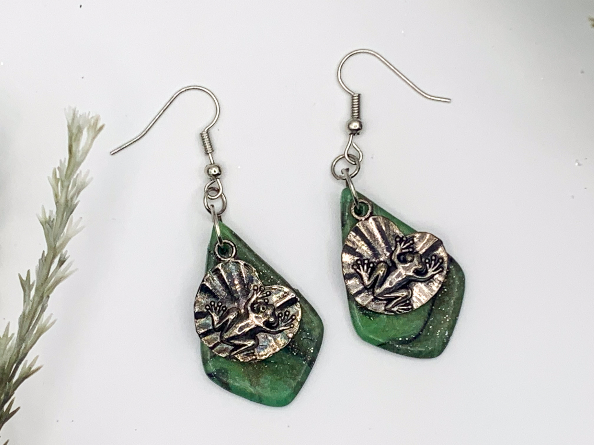 Nature-inspired and full of personality! These green clay earrings feature layered lily pad shapes topped with a silver frog charm for a whimsical, earthy vibe.