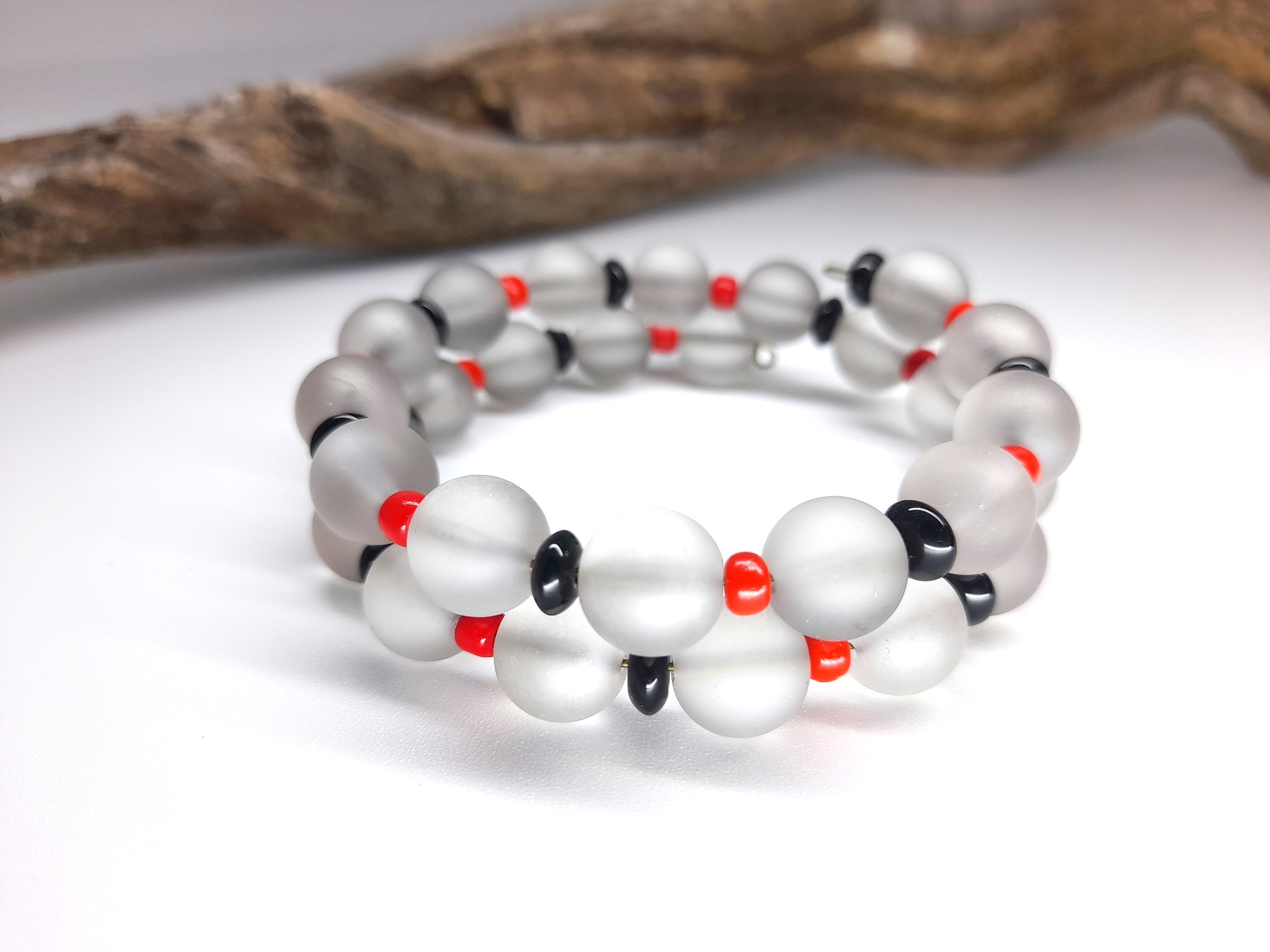 This glass beaded bracelet has red and black accent beads.