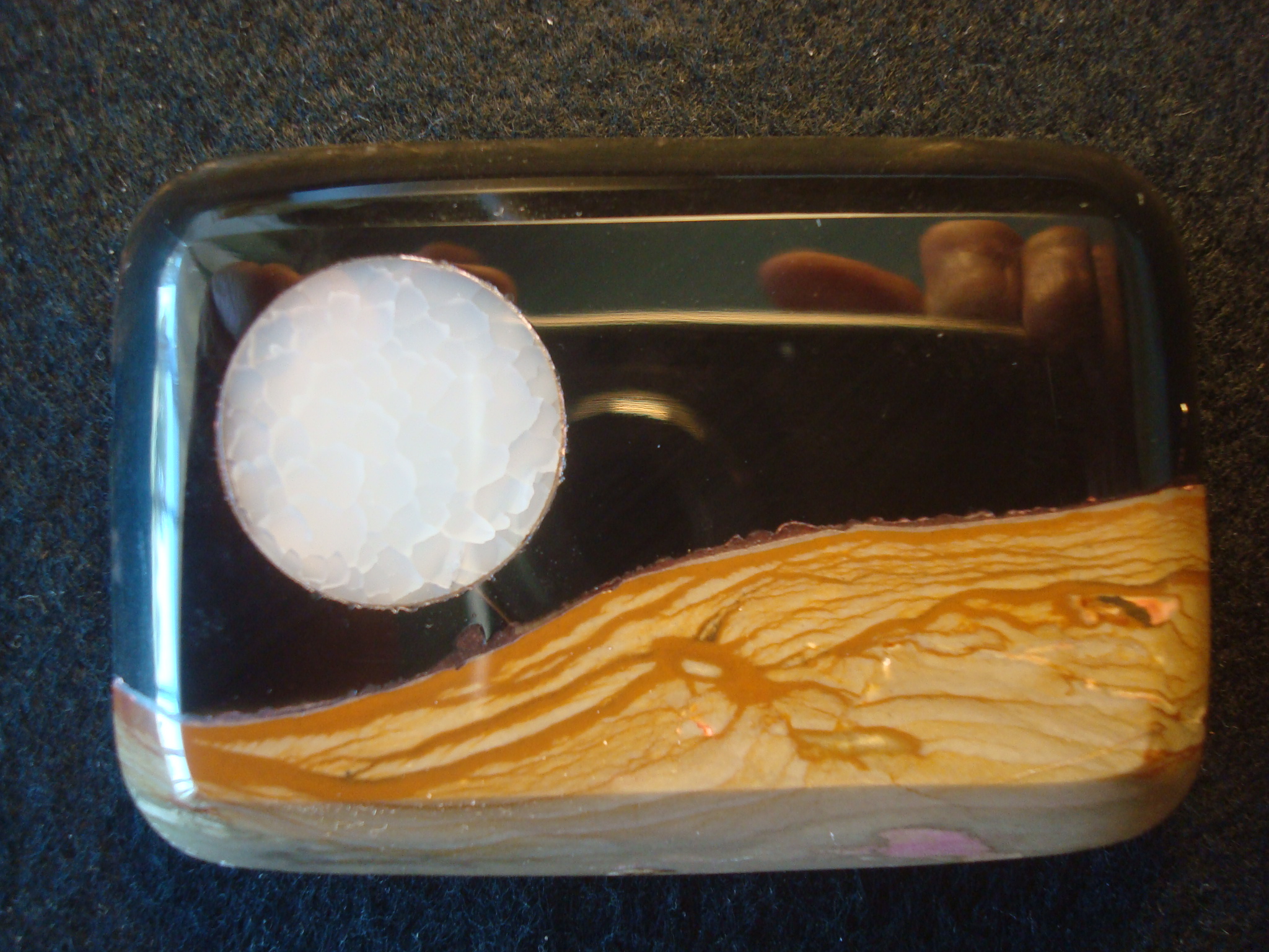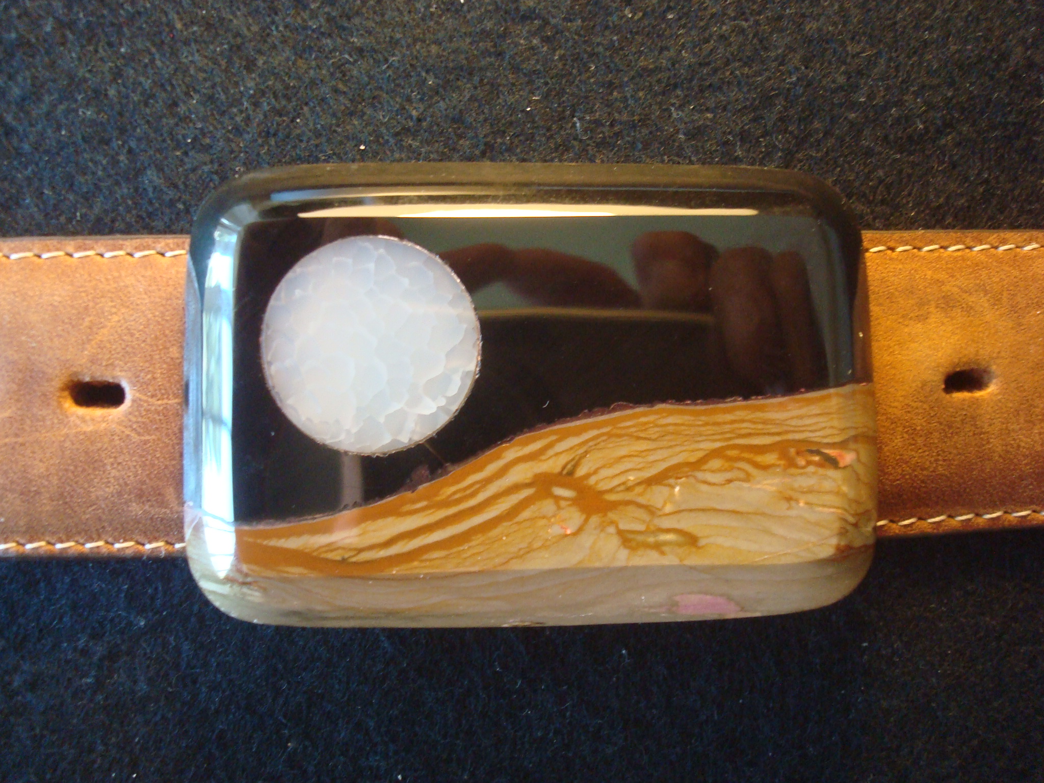 This piece is made with picture jasper,obsidian and brazilian agate for the moon. I have supported these stones with my handmade German silver backing. The backing is signed and dated and the stones are also identified on the backing. This buckle measures 2" by 3" and will fit a belt up to 1 1/2" in width. One note, German silver is not silver but an alloy also known as nickle silver and it is comprised of nickle ,zinc, and copper. I use it because it is less expensive which keeps the price of my buckle's down, it is stronger and it doesn't tarnish like silver.