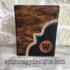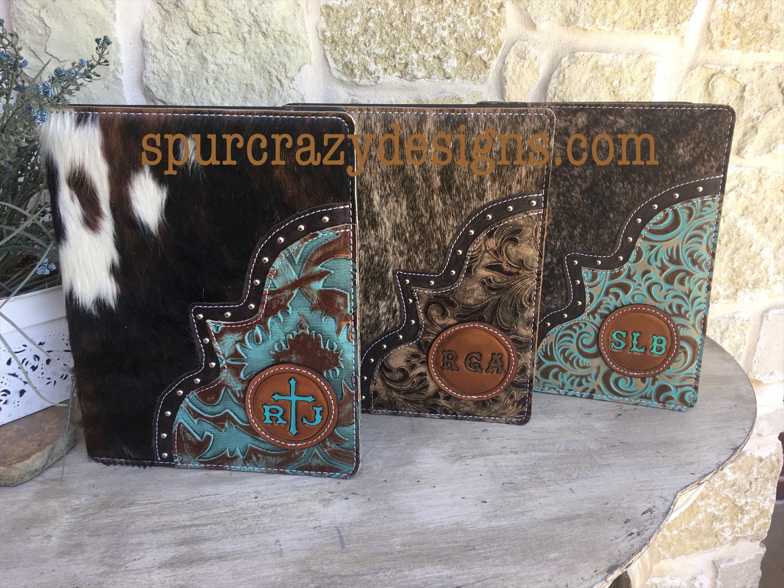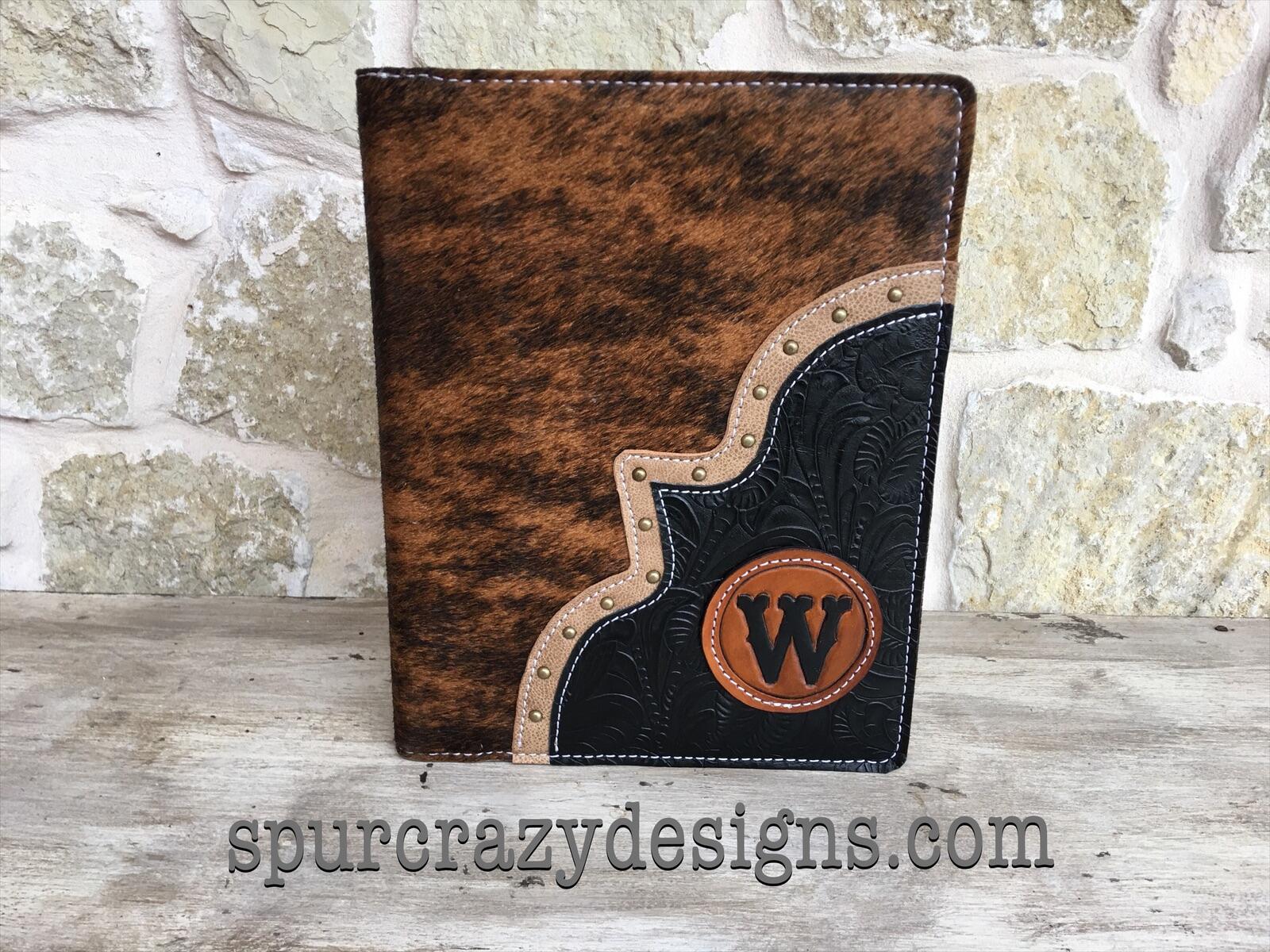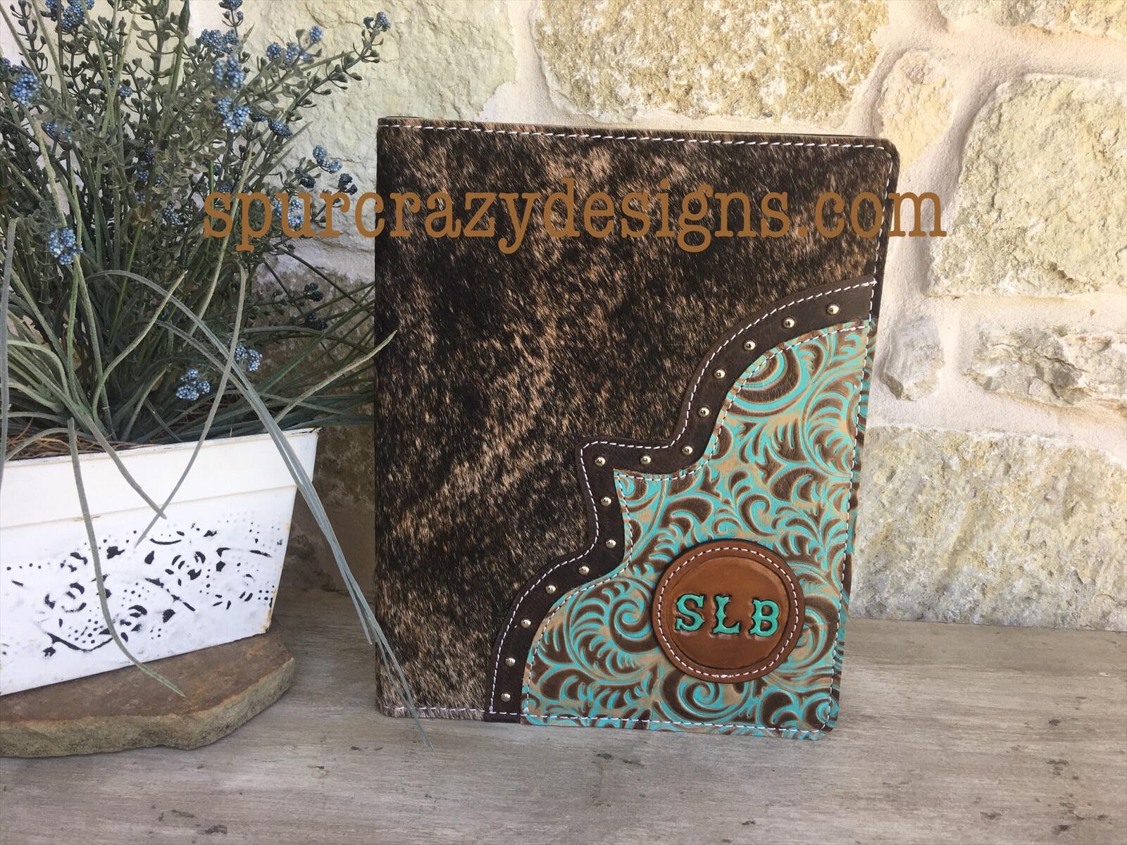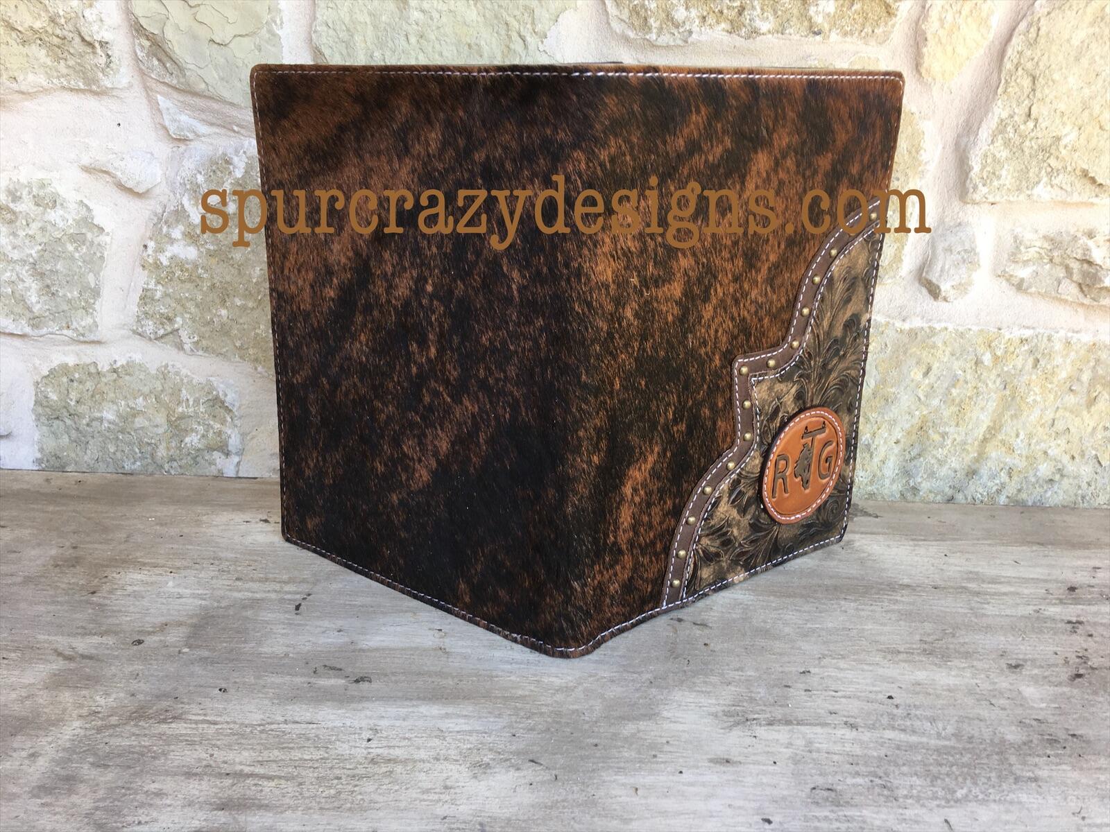 Professional portfolios trimmed in cowhide and embossed leather, fully covered on front and back. A hand tooled leather round with your initials or brand is attached to the front to personalize this classy office accessory. Several lovely leather options and colors to choose from. Side pocket and card holder inside. Go to your meetings in style! If you would like your brand on the portfolio instead of letters, please message me and send a picture of the brand. Some brands are not easily tooled in such a small area so please ask before ordering.