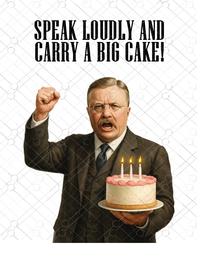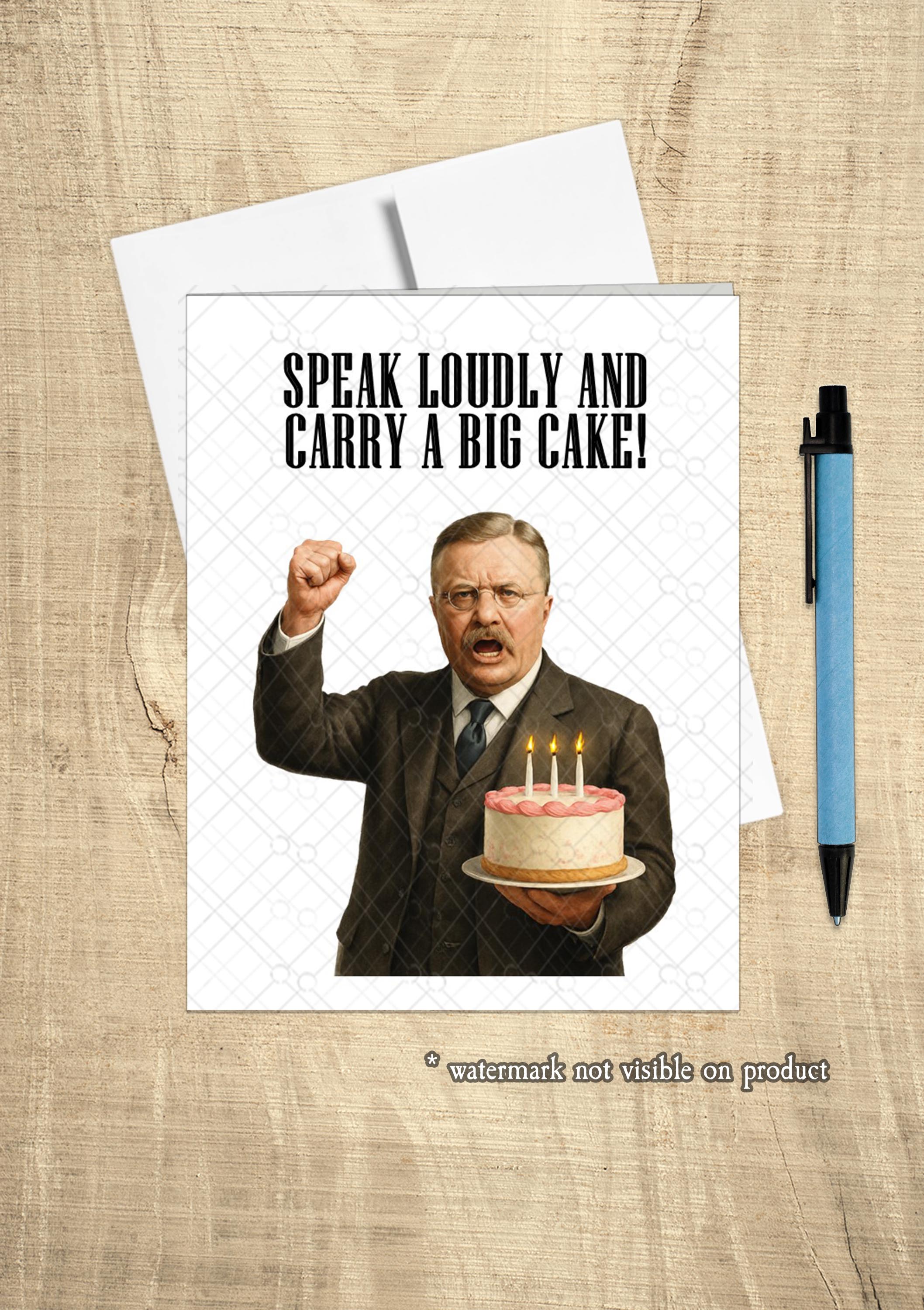 Teddy Roosevelt once said, “Speak softly and carry a big stick.” But when it’s your birthday? You yell about it. With frosting. This bold and booming card features the Rough Rider himself doing what any true leader would do: wielding a cake like it's statecraft.