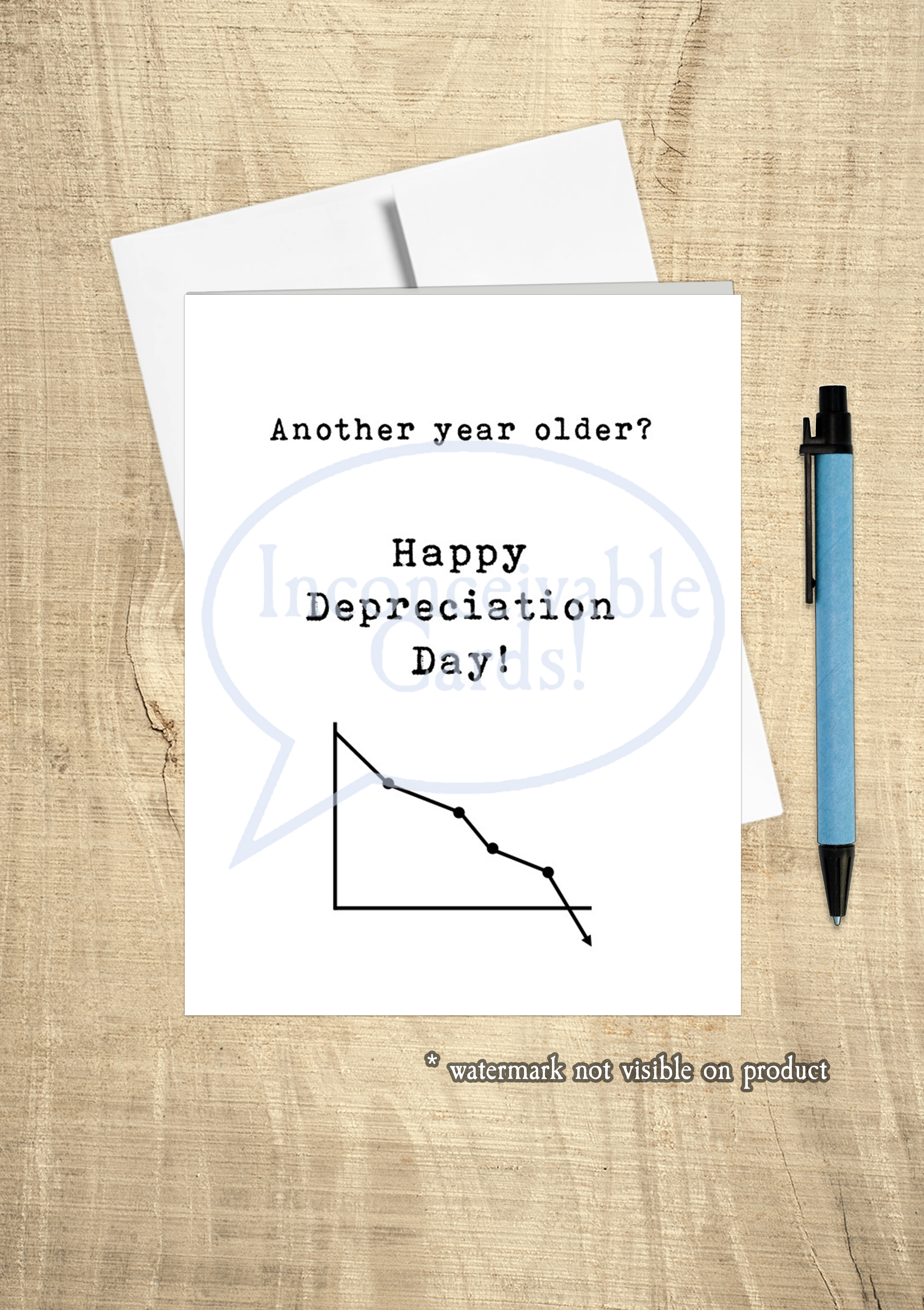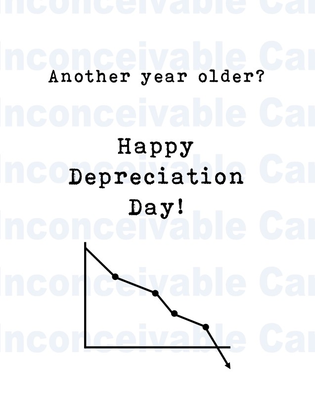Front Text: “Another year older? Happy Depreciation Day!” (with tragic line graph for emotional support)