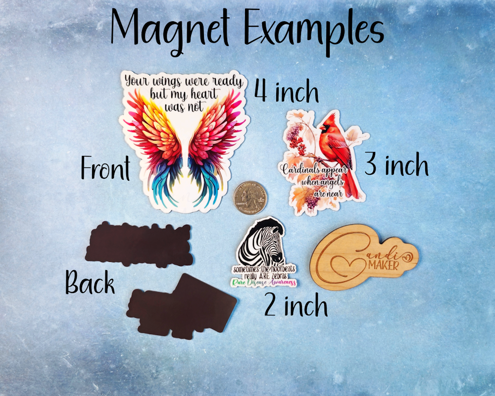 - Please see the “Magnet Examples” listing photo to see the quality of CandiMaker magnets. These are just samples; all magnets are made to order and the magnet in this listing will have the same design shown in the first/main listing image. Use the dropdown box to choose your material preference.