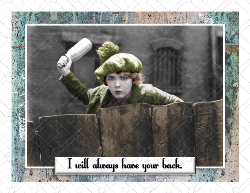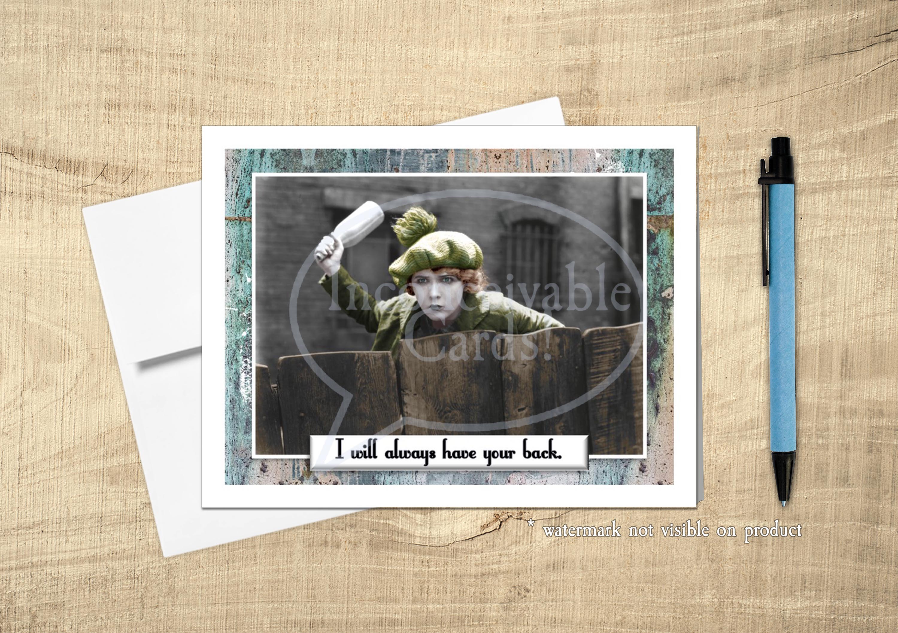 For that one friend who’s always down to throw hands—or at least wave an empty bottle—on your behalf. This vintage-inspired card says what you already know: loyalty comes with a touch of chaos. Featuring a colorized retro photo of a woman in a green cap ready for action, this card is perfect for birthdays, thank-yous, or just reminding your bestie that you’ll always be their ride-or-die.