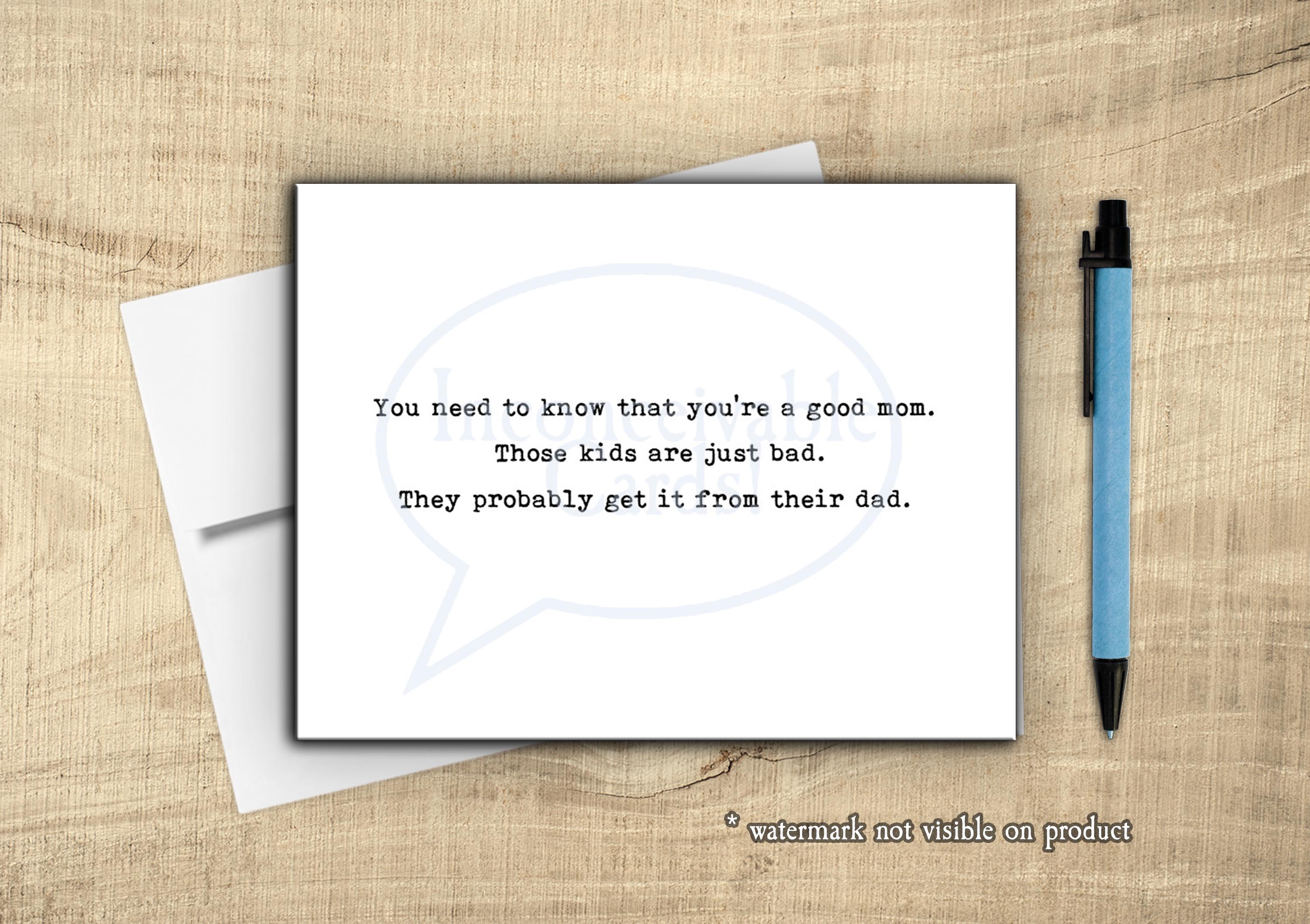 A little truth bomb for your favorite mom friend who's hanging on by a thread and a half-empty wine bottle. This card offers the kind of validation every mama needs: You’re not the problem—the tiny humans and their father are.