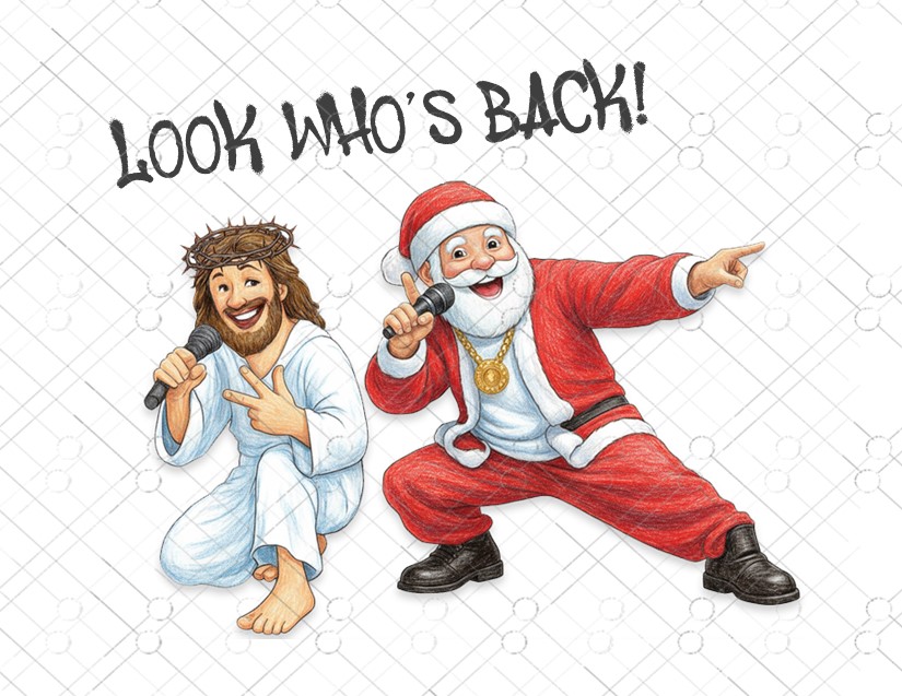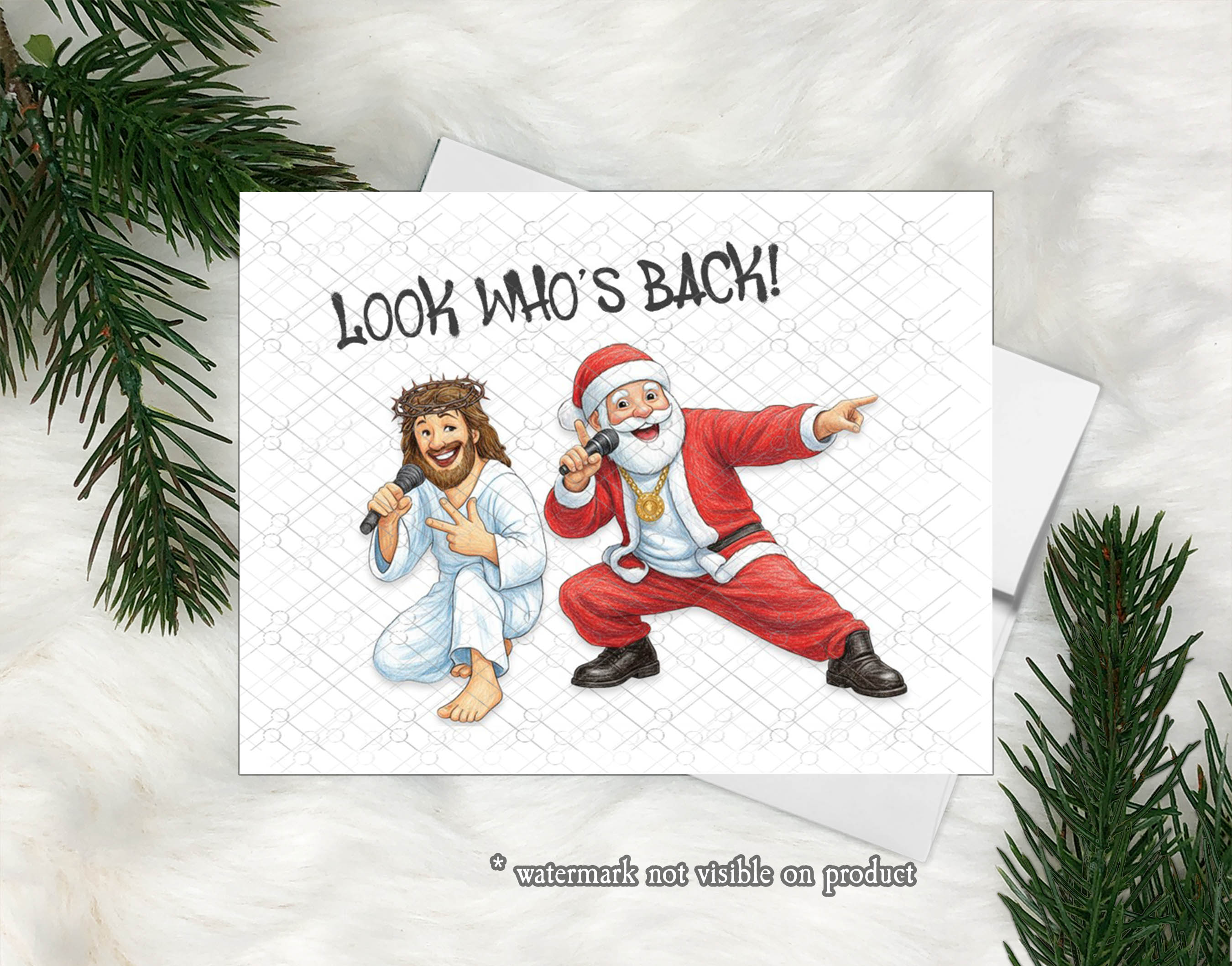 This irreverent holiday card features Santa and Jesus reuniting like the ultimate comeback duo—microphones in hand, big smiles, and zero apologies. Perfect for anyone who loves Christmas, pop culture humor, and cards that toe the line with confidence. Equal parts festive and hilarious, this card is guaranteed to get a reaction (and probably a laugh-snort).