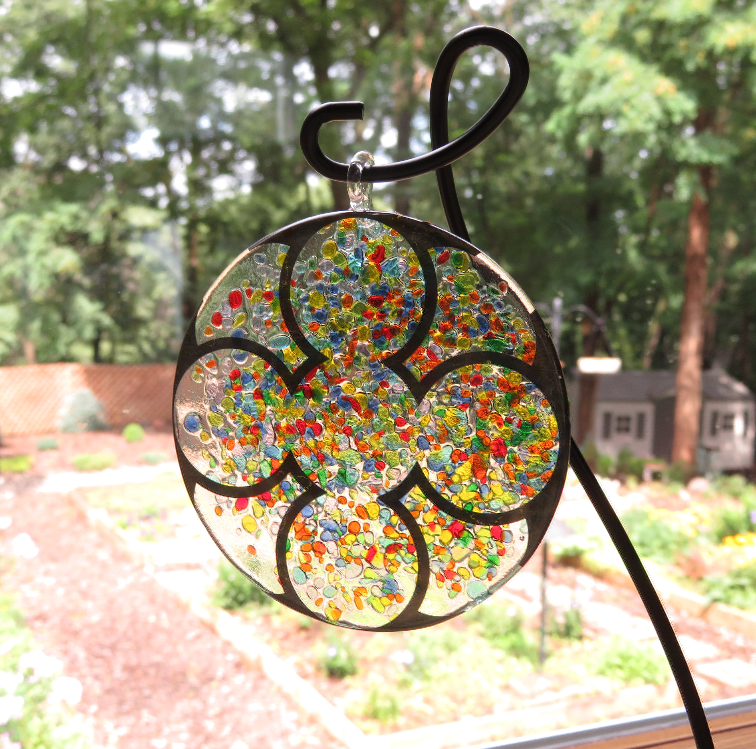 This suncatcher was handcrafted using a mixture of colored crushed glass and fired in my kiln. It was then fired a second time in order to have the decal adhere permanently to the glass.