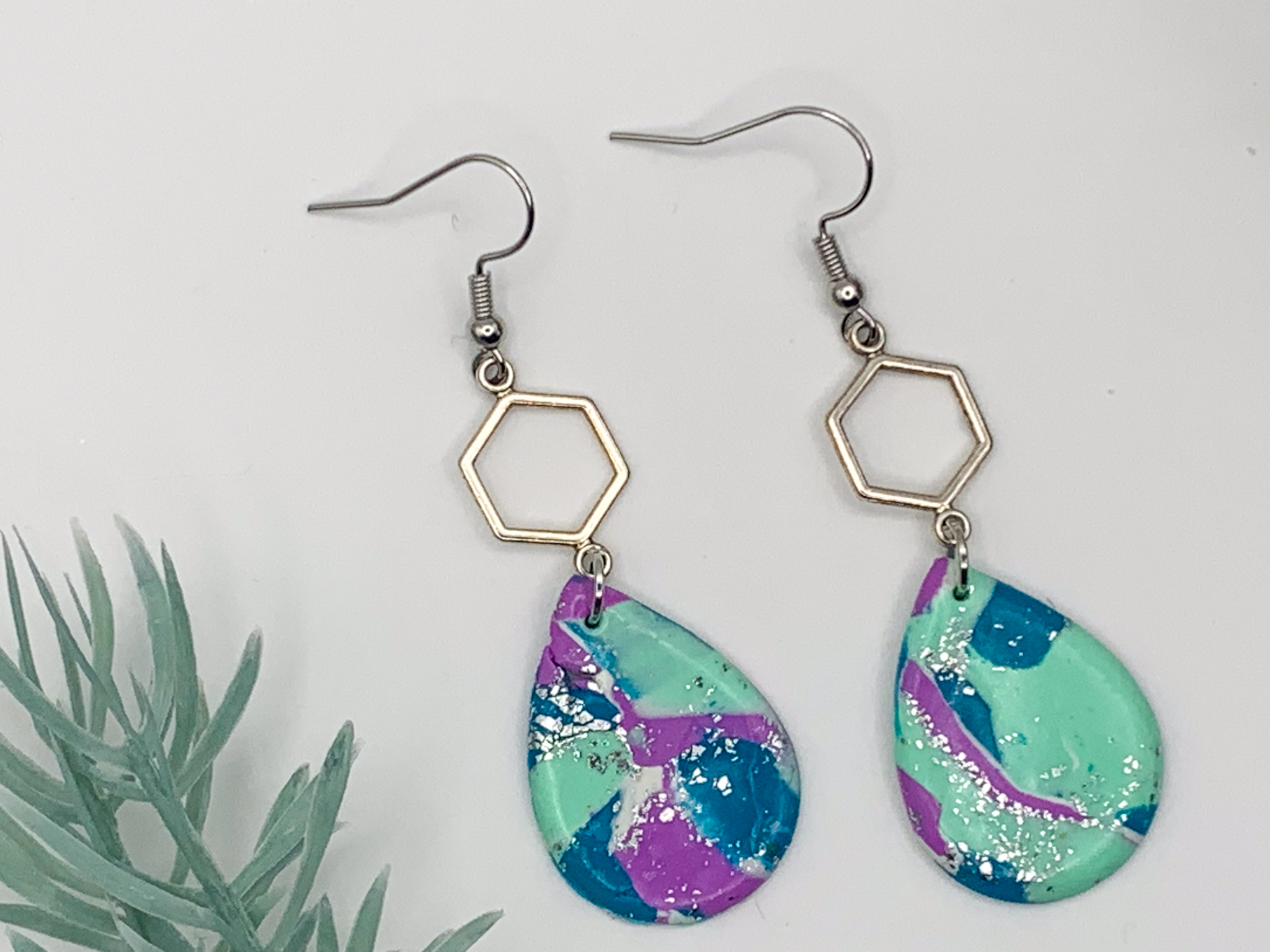 Bold and colorful! These teardrop earrings feature a vibrant marbled mix of teal, purple, and blue with shimmering silver foil accents, paired with a chic hexagon connector for a modern twist.