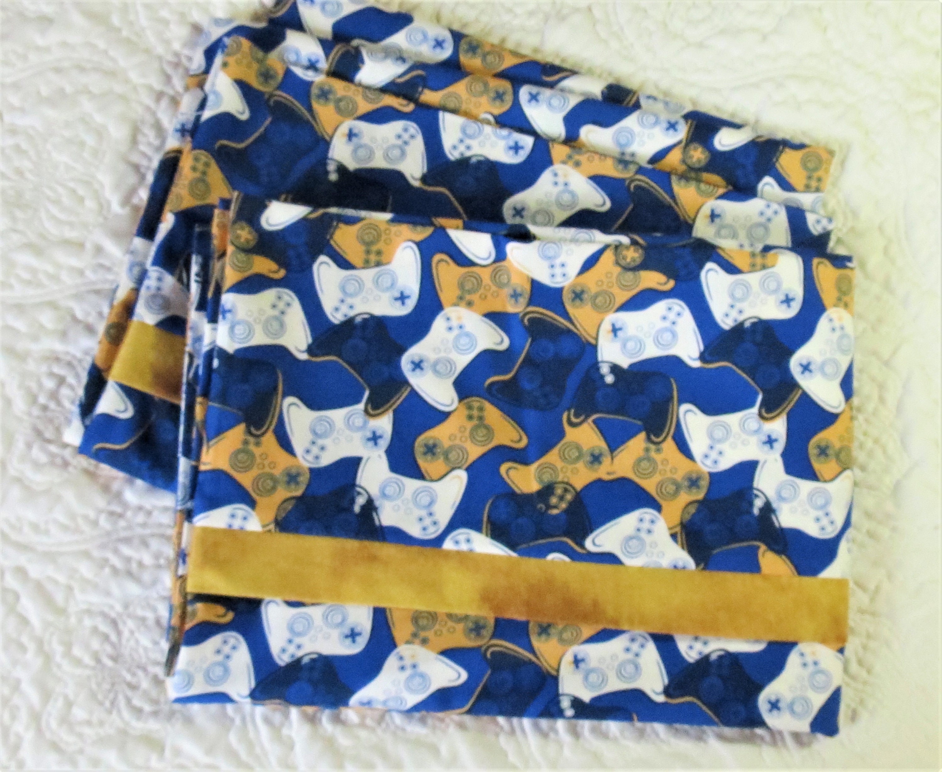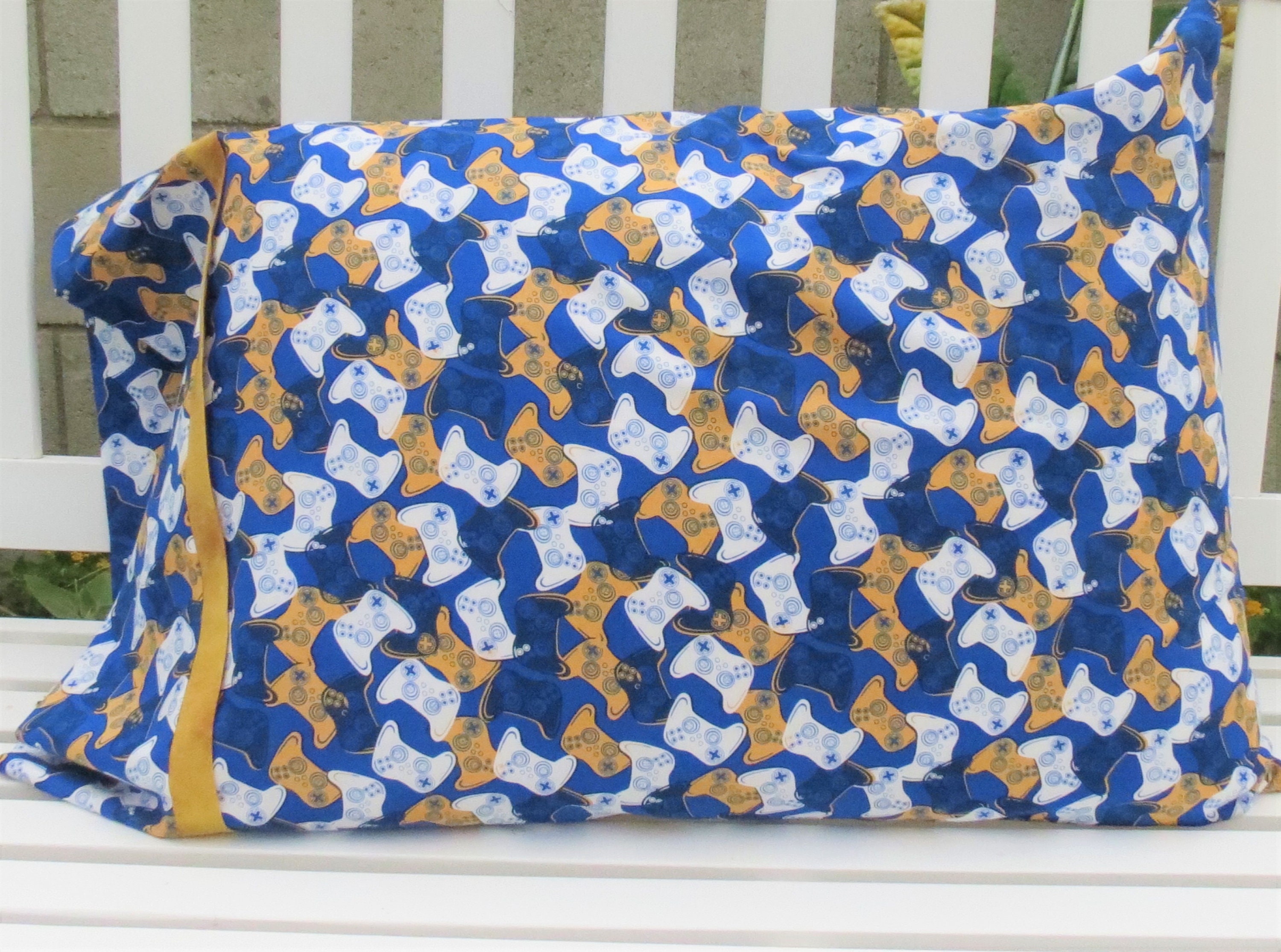 Game Controller pillow cases. This wonderful fabric is a mustard and blue with gamer controllers print fabric created into unique pillow cases. A gold trim on the band completes this fun pillow case. An awesome gift idea! Roll it up to add to that perfect gift basket.