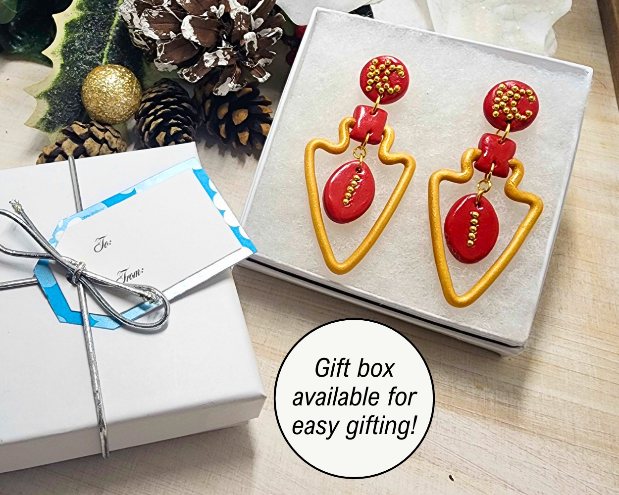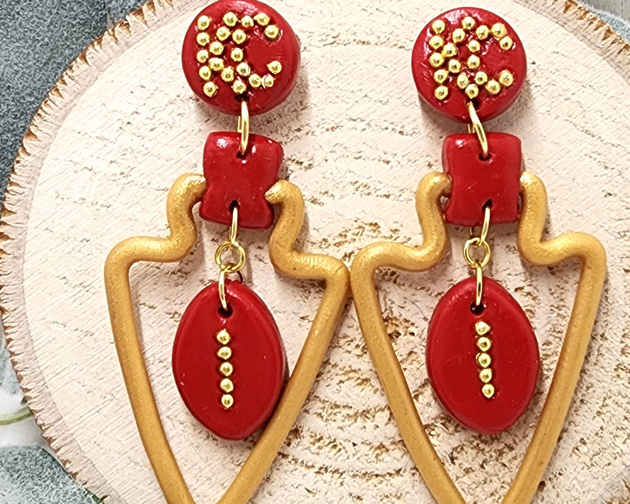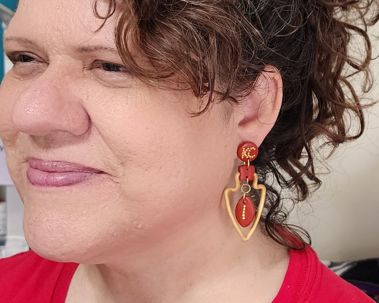 Show off your Kansas City pride with these stunning, handcrafted polymer clay dangle earrings! Designed with the dedicated fan in mind, these earrings capture the iconic Red and Gold colors and signature arrowhead shape, making them the perfect accessory for Game Day, tailgates, or celebrating your favorite team.