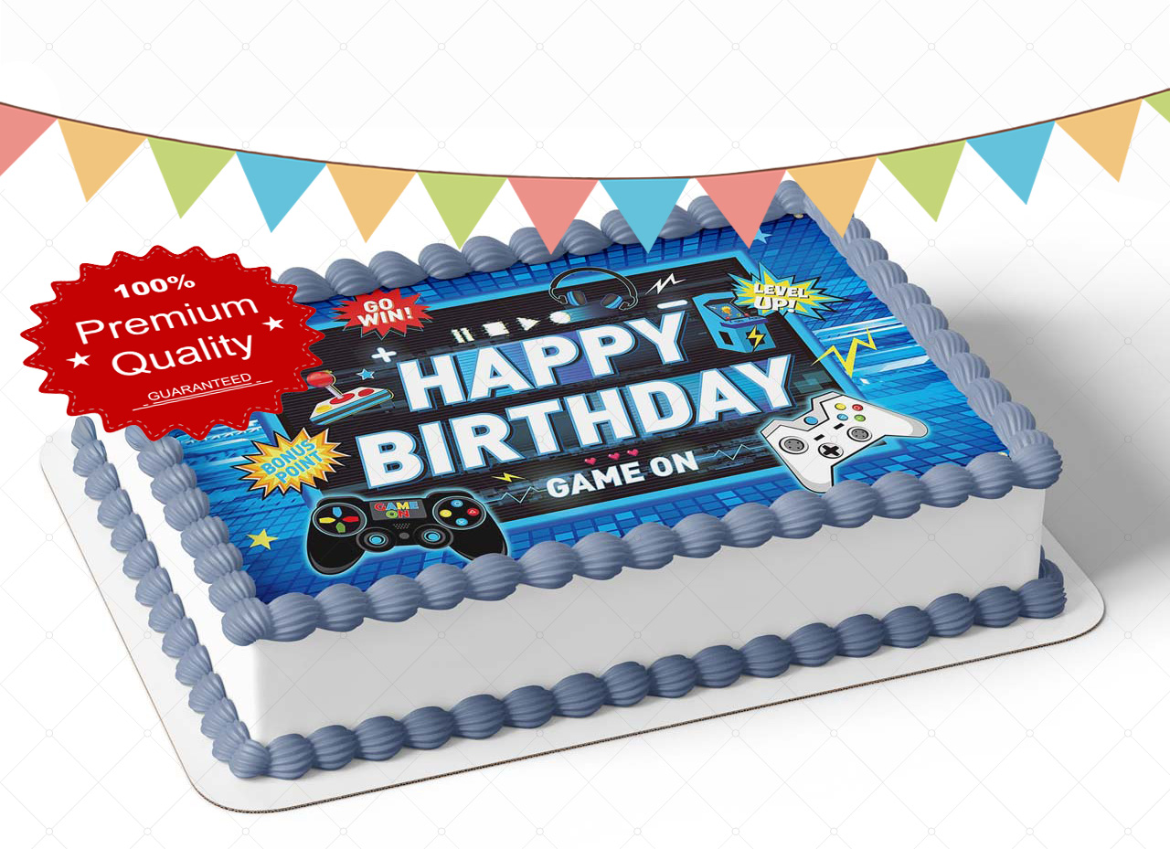 Game On Gamer Level Up Controller Blue Game Over Unlocked Edible Image Themed Edible Birthday Party Cake Topper Sheet Edible Sticker Decal