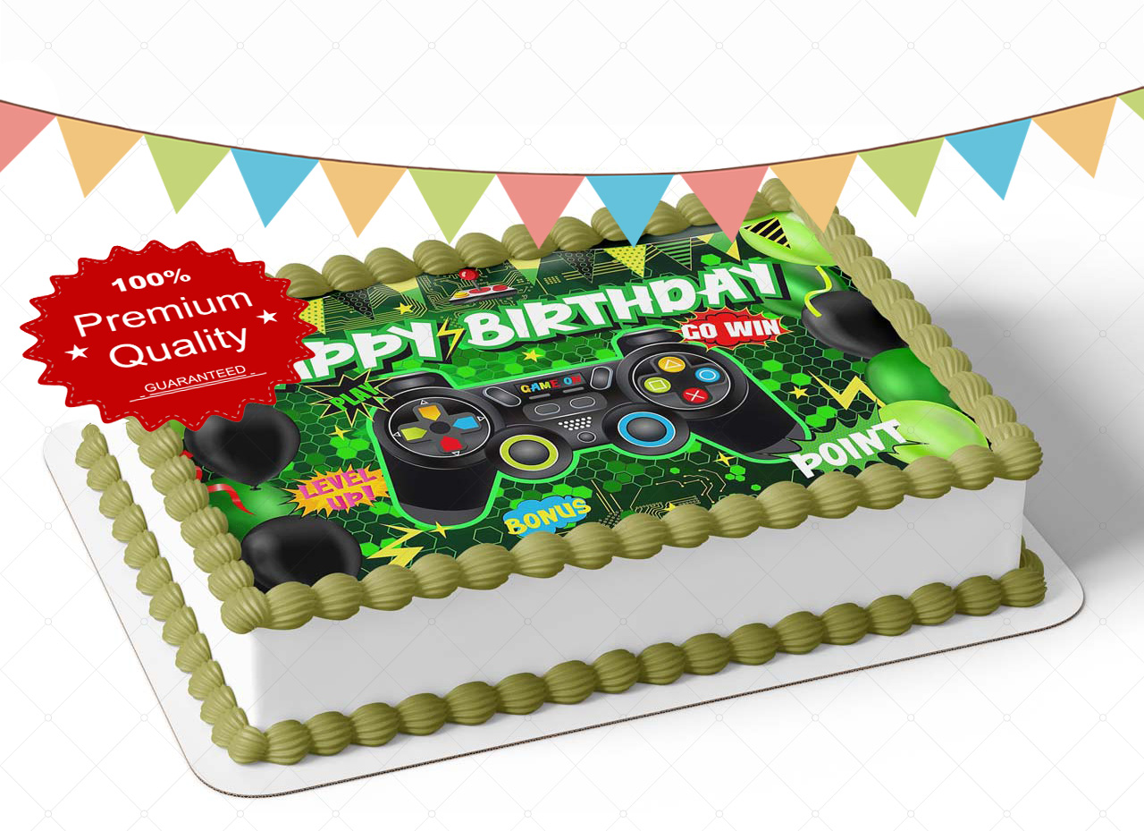 Game On Gamer Level Up Controller Green Game Over Unlocked Edible Image Themed Edible Birthday Party Cake Topper Sheet Edible Sticker Decal