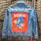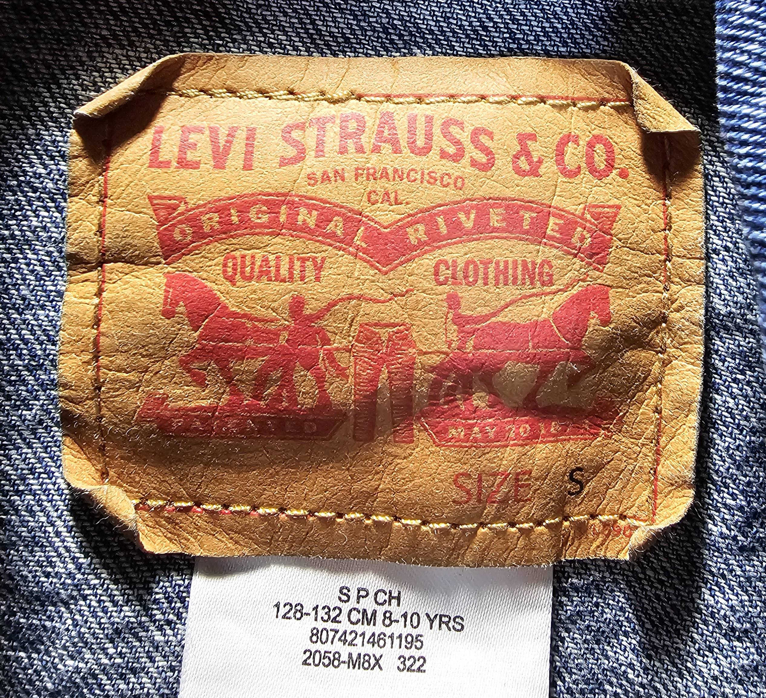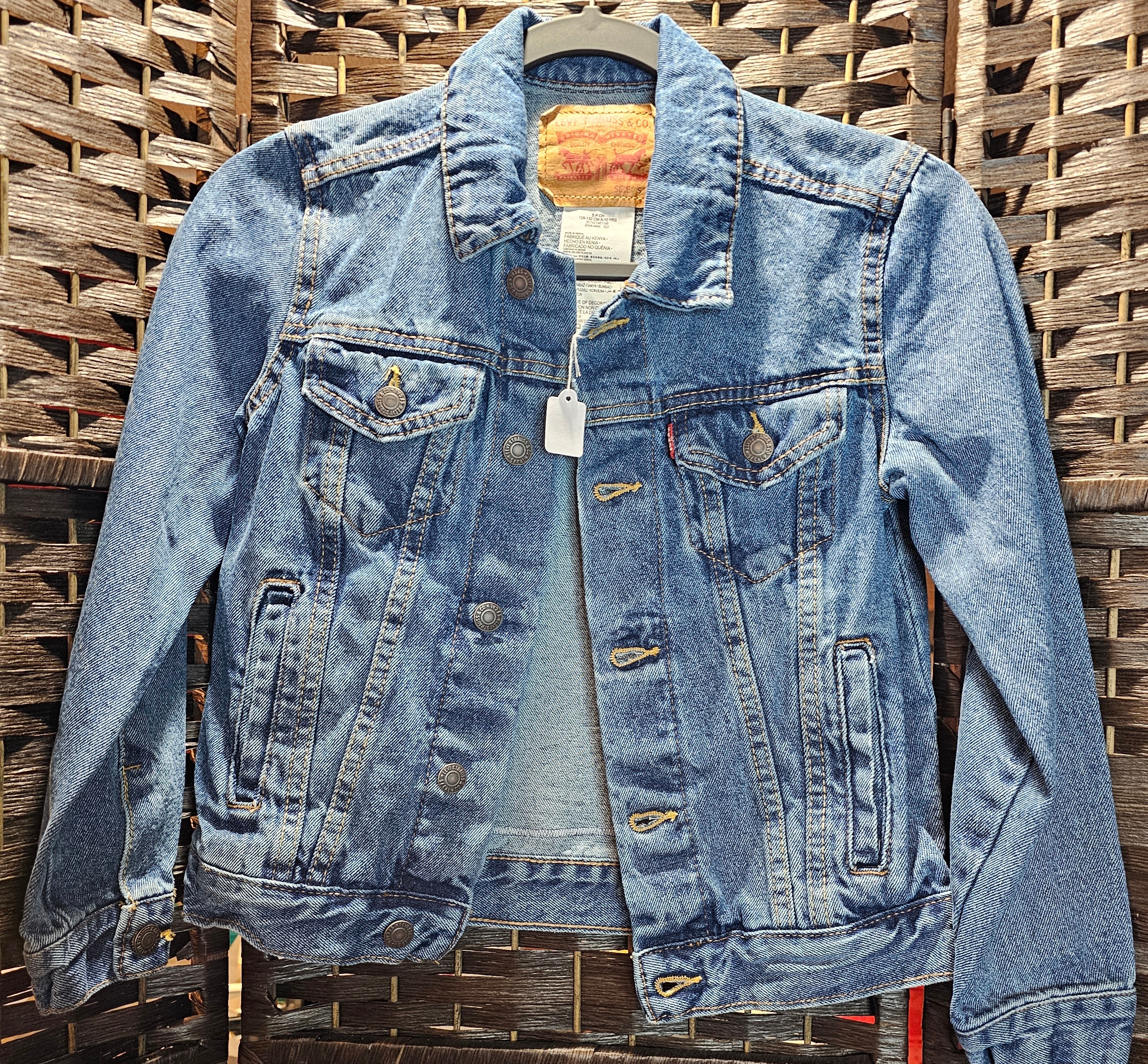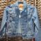 This is a Refashioned youth Levi Strauss Jacket 8/10 that has a panel added to the back. 17 inches across pit to pit. 19 inches long from top of shoulder to bottom of jacket.