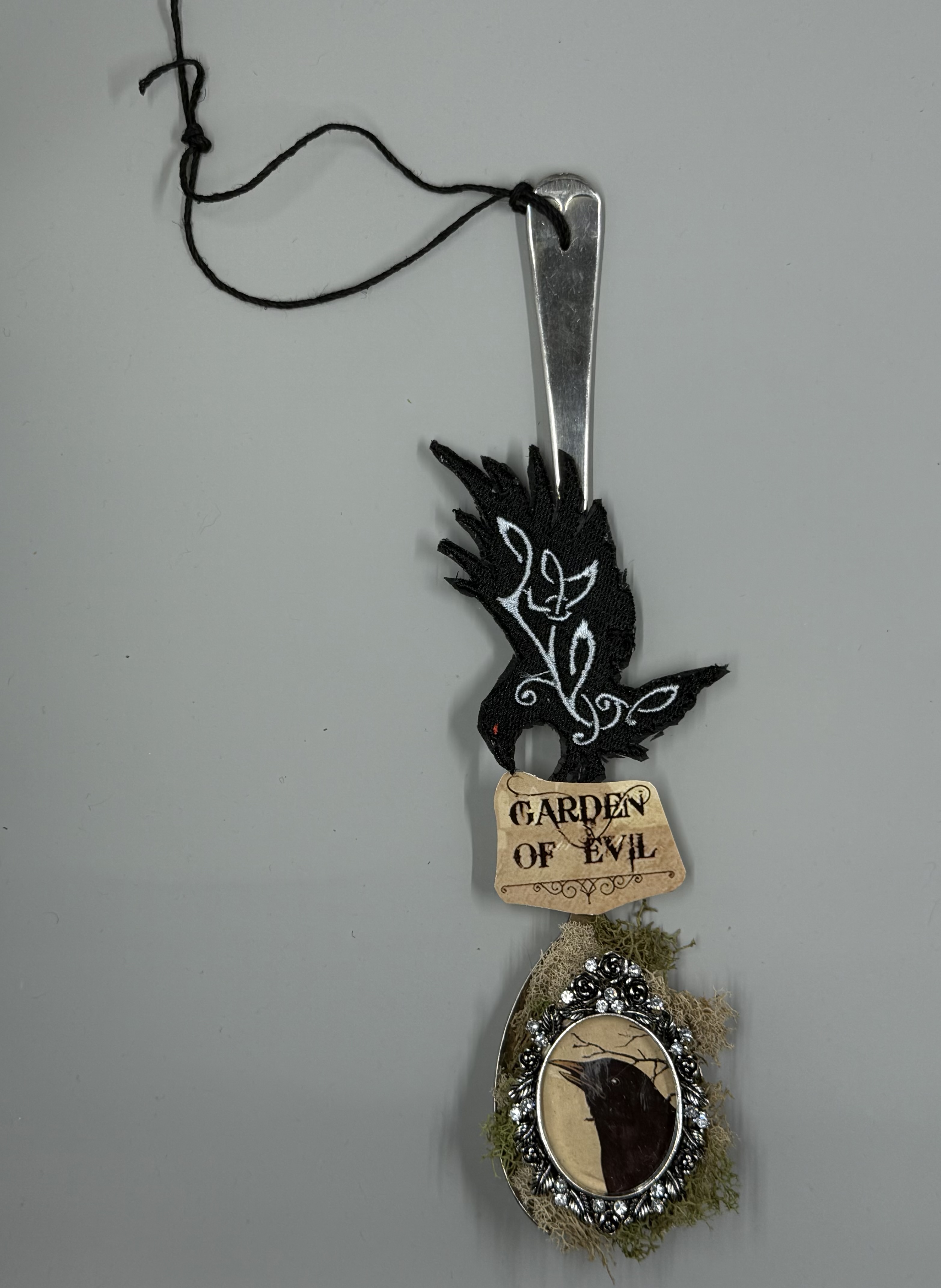 This is a one-of-a-kind Gothic wall hanging the base is a metallic serving spoon in the head of the spoon is a brooch with a crows head, nestled in a bed of moss with a garden of evil sign, and an embroidered crow with an ornate design on the body and wings ready to be hung in anyone’s home