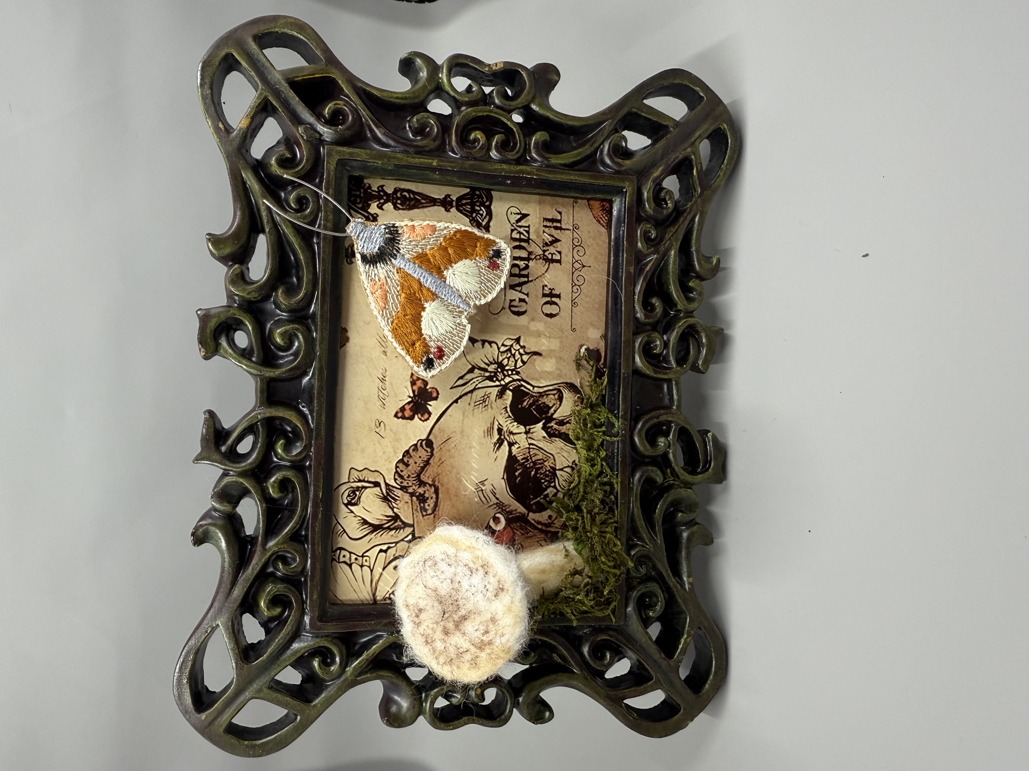 This is an embroidered moth with a handmade fabric mushroom with moss out, lying on display in a metal ornate, distressed frame ready for hanging or shelf display