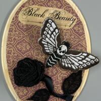 This is an embroidered moth with handmade fiber, mushroom, and moss on display in a distressed metal frame