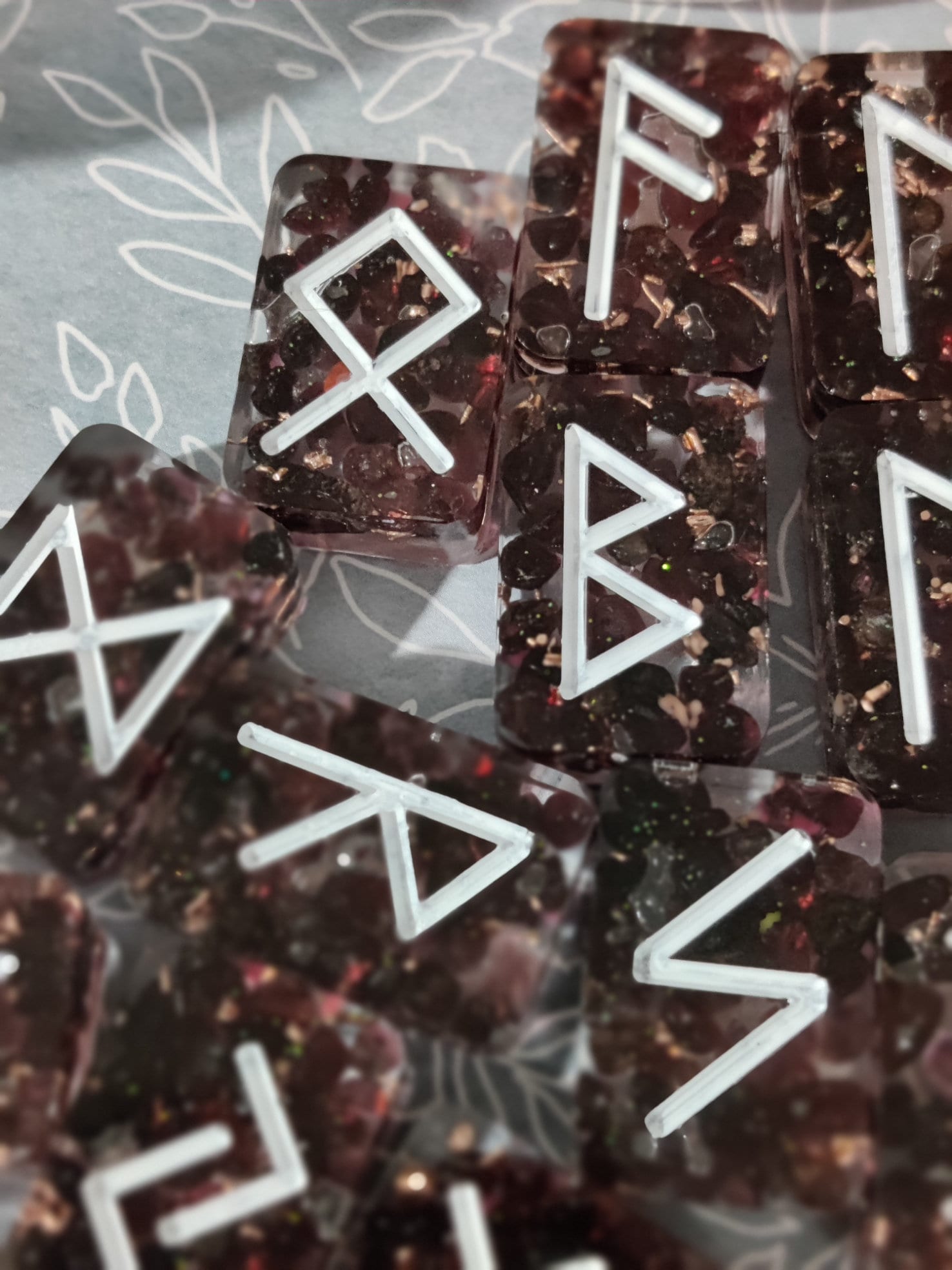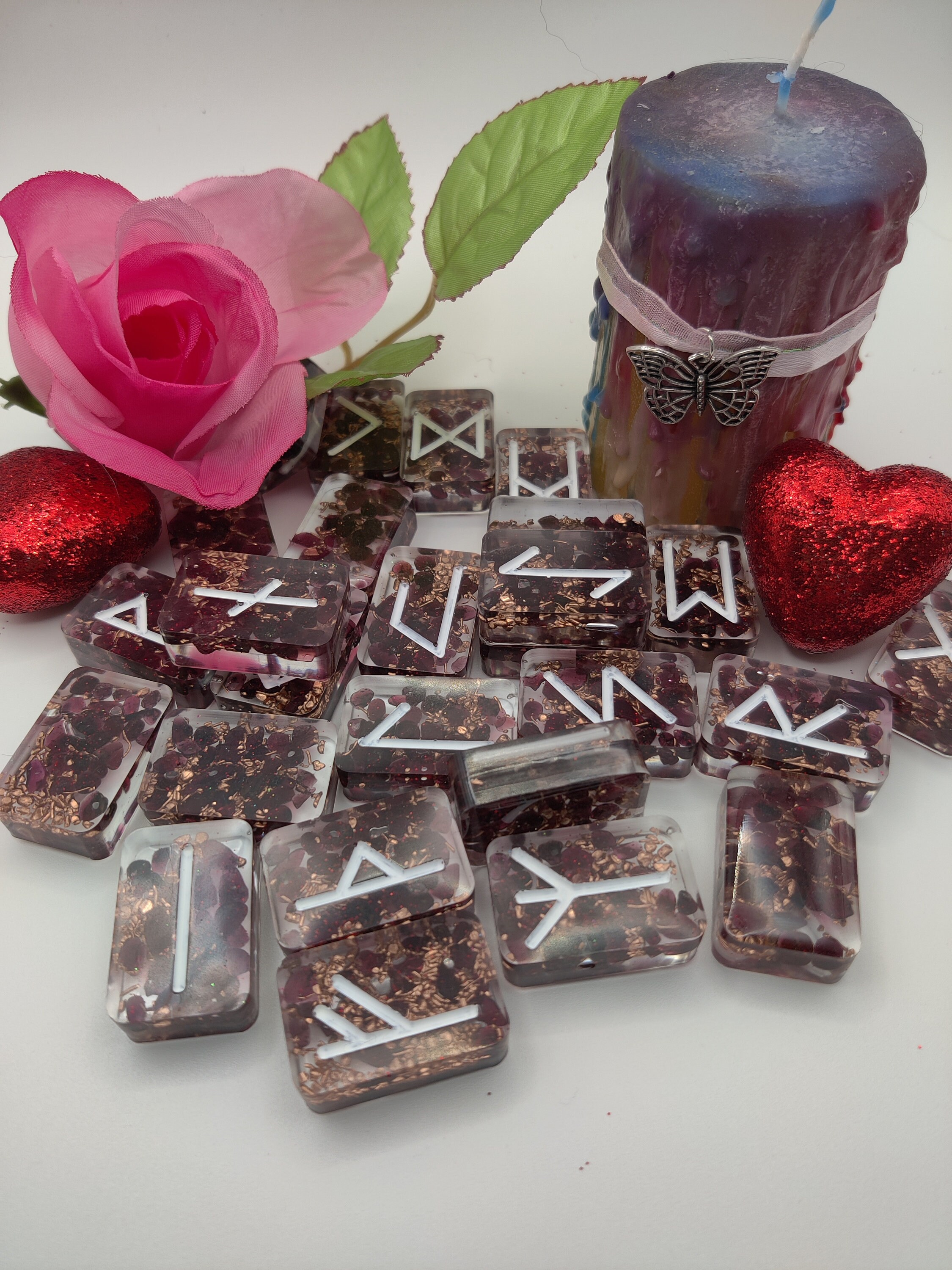 The set includes 24 Elder Futhark runes with 1 blanks plus I have added an extra blank so that you can carry it with you and stay connected to your set.Your set comes with an instruction sheet on how to read runes and how to care for them. please do not leave the in the sun for extended periods of time. This can fade your crystal and cloud your resin.