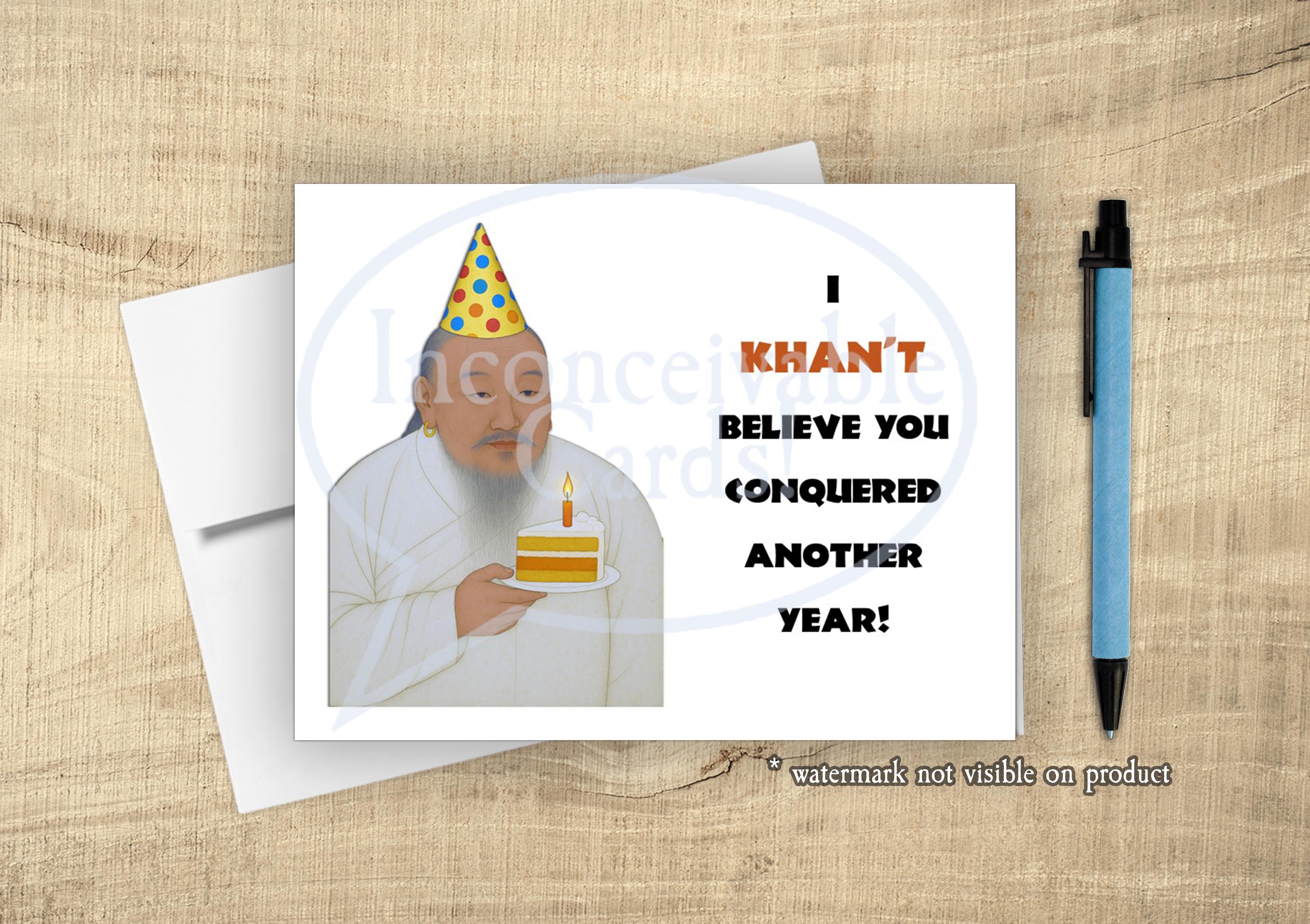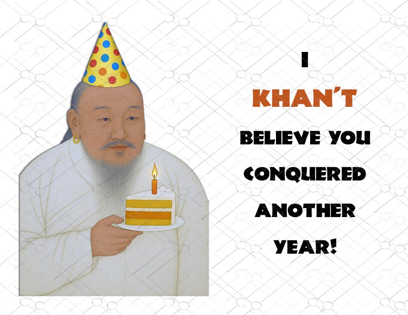 Featuring a party-hat-wearing Genghis Khan holding a slice of cake like it’s sacred plunder, this card screams: “I Khan’t believe you made it another year without getting overthrown.”