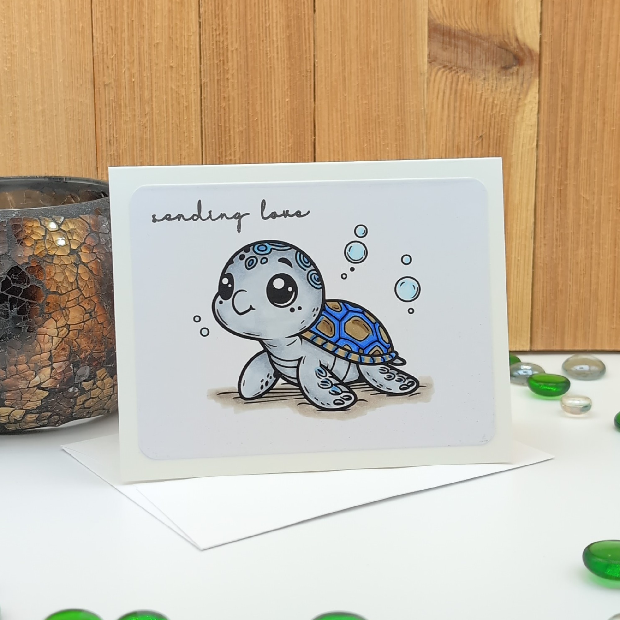 This handmade greeting card features a charming turtle surrounded by bubbles, lovingly colored with alcohol markers to evoke a soft underwater scene. The front reads “Sending love” in gentle script, while the inside is left blank for your heartfelt message. Whether it’s for encouragement, connection, or just because, this card offers a tender way to reach out. Crafted with care and rich in detail, it’s a versatile piece for any season of life.