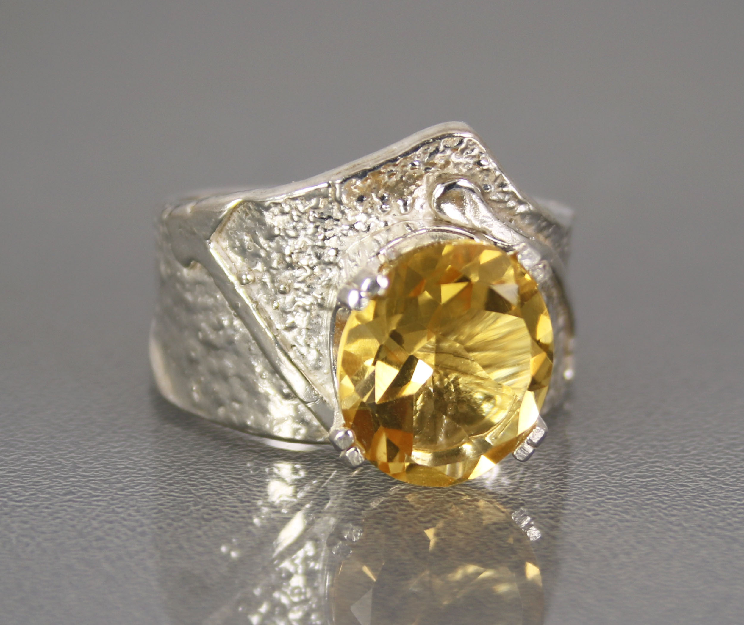 Dazzling 4 carat golden citrine gemstone set in sterling silver on a textured band. This unique ring is a perfect engagement ring or wedding ring for anyone with distinctive style. This non traditional style ring is very comfortable to wear and makes an exceptional fashion statement. Designed and fabricated by Ran Armstrong.