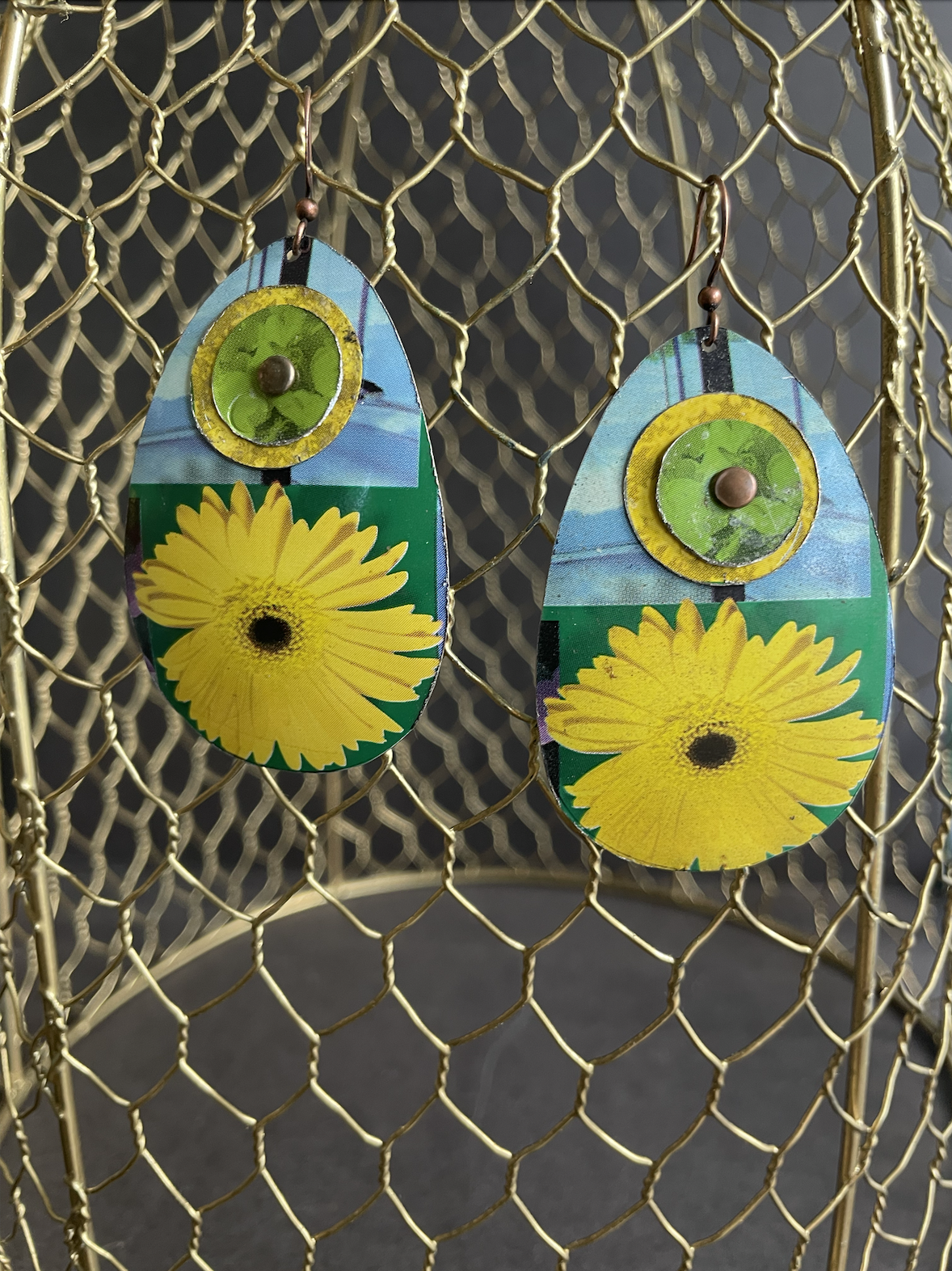 Who says you can't make beautiful earrings from old cigarette tins? These feature gerber daisies. The earrings are copper with no nickel.