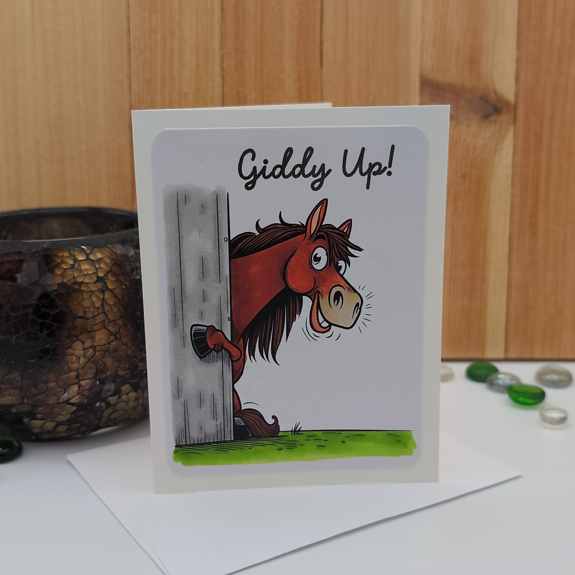 This handmade birthday card features a spirited brown horse with a wide smile and tousled mane, peeking out from behind a rustic wooden post. Colored with alcohol markers for rich detail and playful expression, the front reads “Giddy Up!” in bold, cheerful script. Inside, the message “Happy Birthday” awaits—ready to brighten someone’s special day. With its rustic charm and whimsical energy, this card is perfect for animal lovers, farm enthusiasts, or anyone who appreciates a joyful celebration.