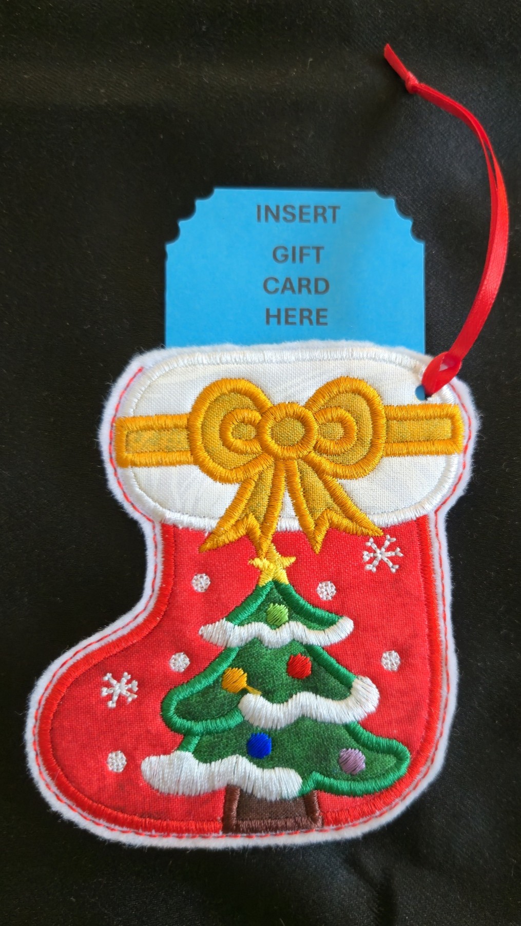 This item combines both fabric, thread, and appliqued to create unique embroidered gift card holders to hang on Christmas trees or in stockings.