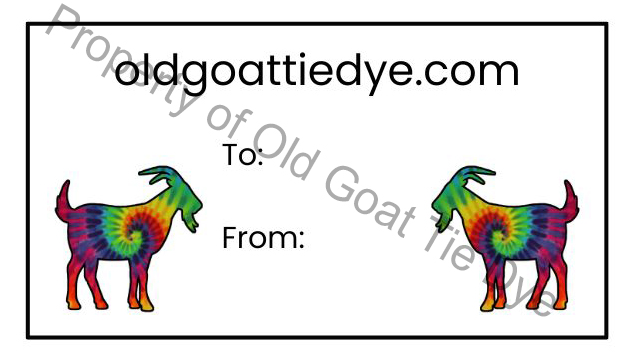 To the left & right is the Old Goat Tie Dye logo, while the center has plenty of room for a To: and From:. Along the top is the Old Goat Tie Dye web address.
