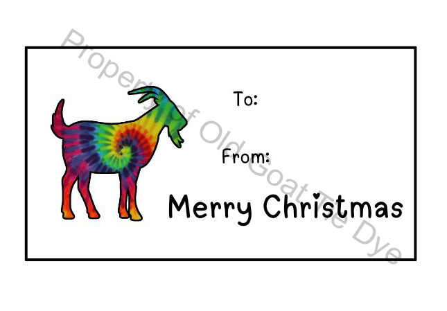 To the left is the Old Goat Tie Dye logo, while the right has plenty of room for a To: and From:. Merry Christmas runs across the bottom of the tag.