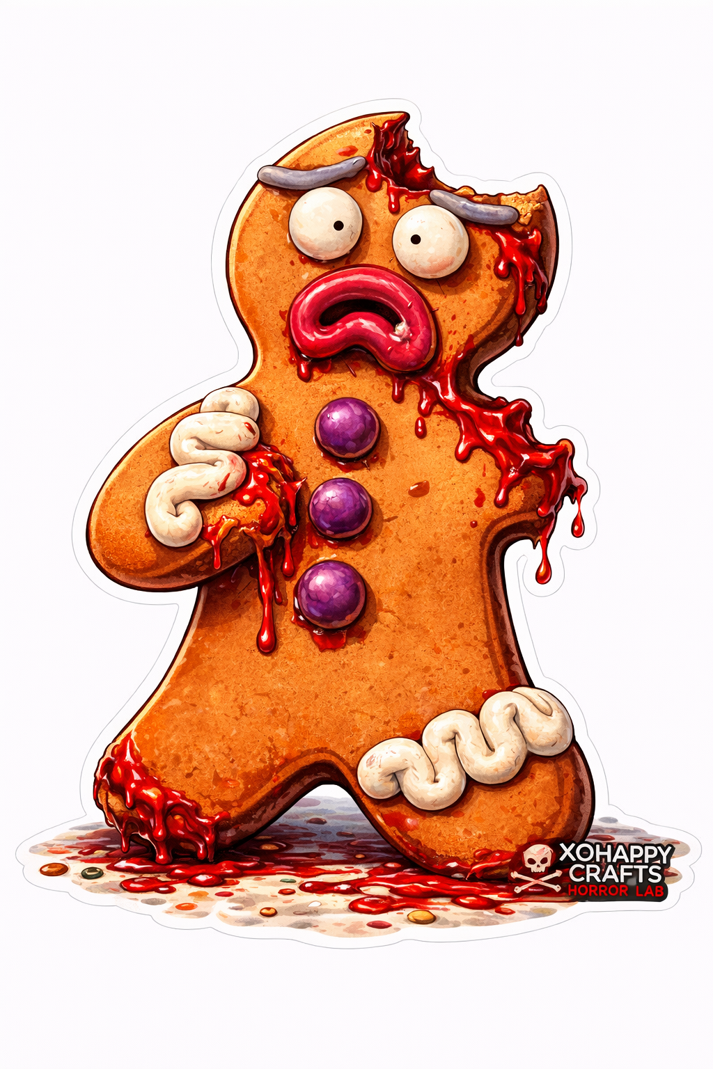 Meet GingerDEAD, the most unlucky cookie to ever escape the oven. This creepy-cute horror sticker features a gingerbread man with cracked icing and dripping candy-blood — equal parts adorable and terrifying.