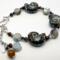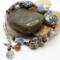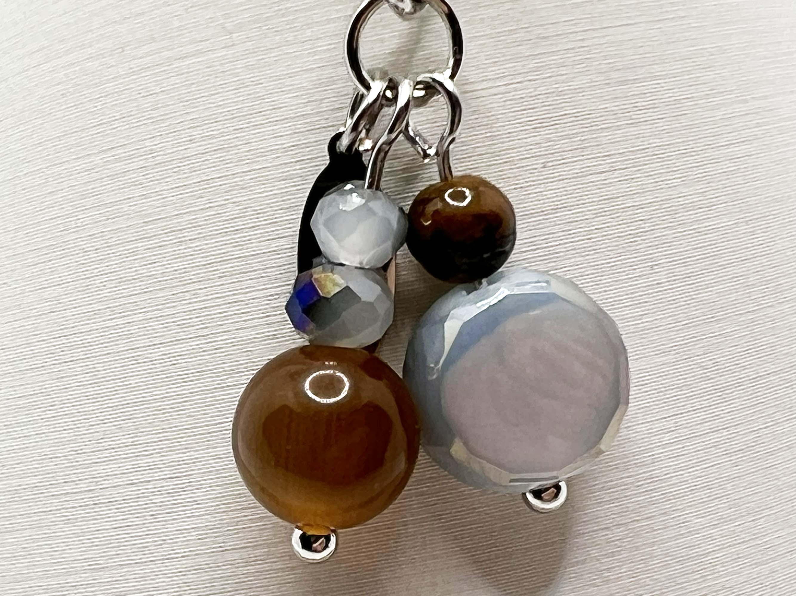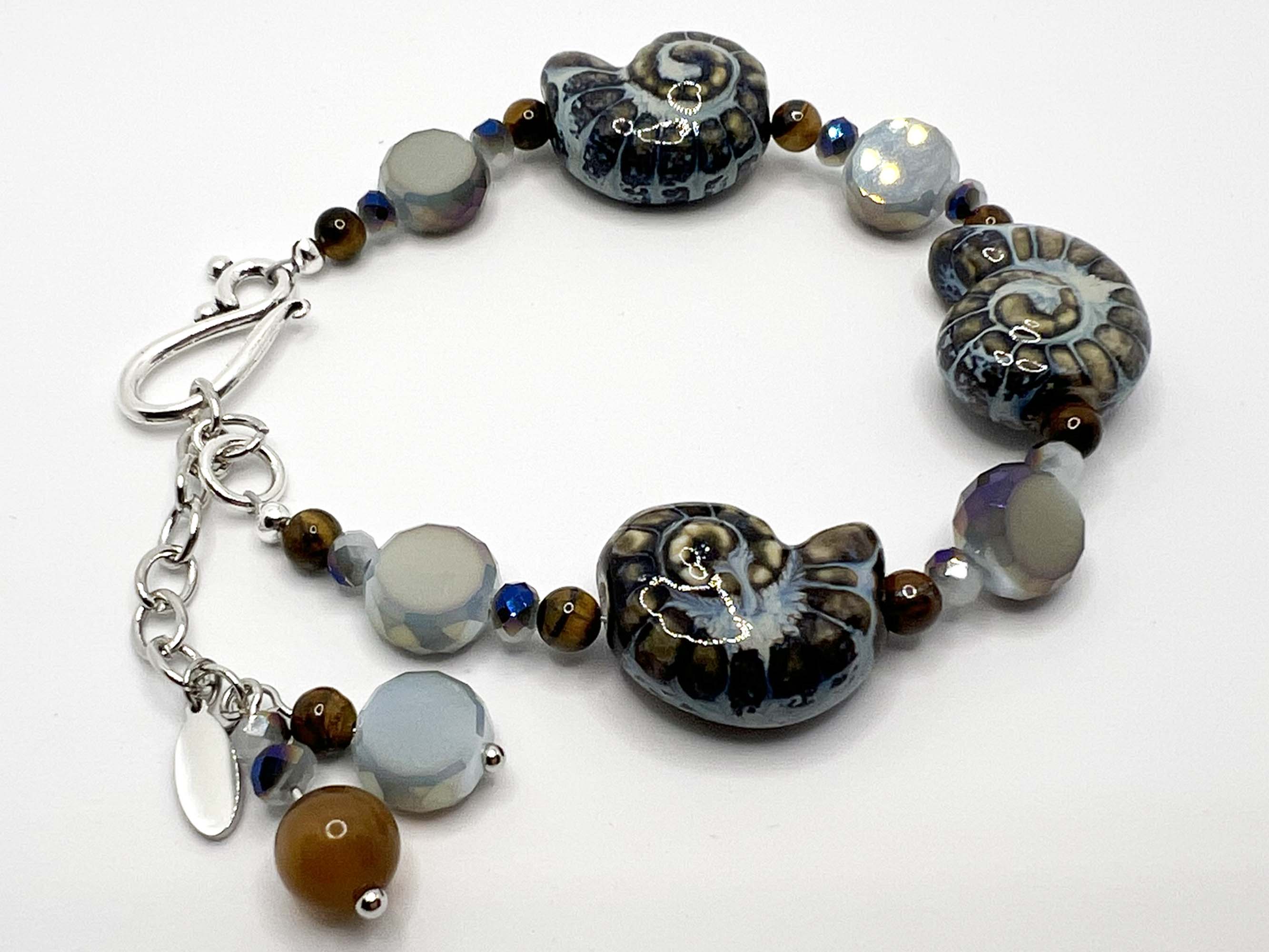 • Beads: 20mm glass shells, 10mm flat glass rounds, 4mm tiger’s eye, 4mm faceted crystals