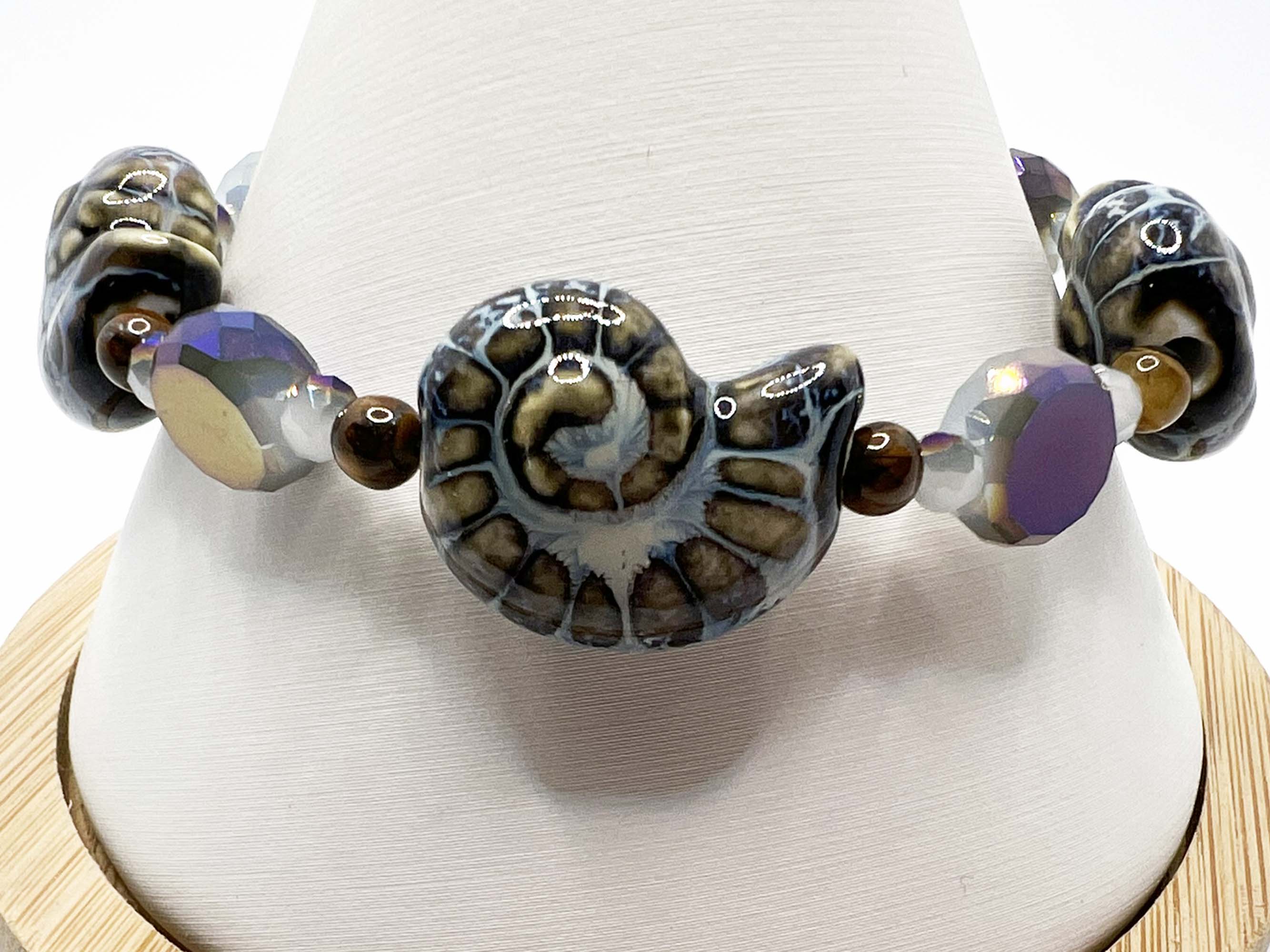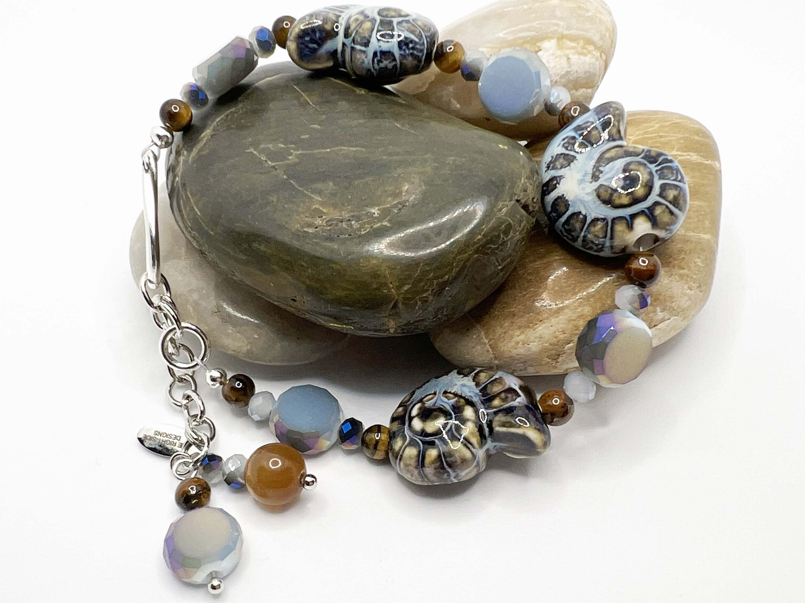Bring a touch of coastal charm to your style with this handcrafted adjustable bracelet featuring three 20mm glass conch shell beads in earthy ocean tones.