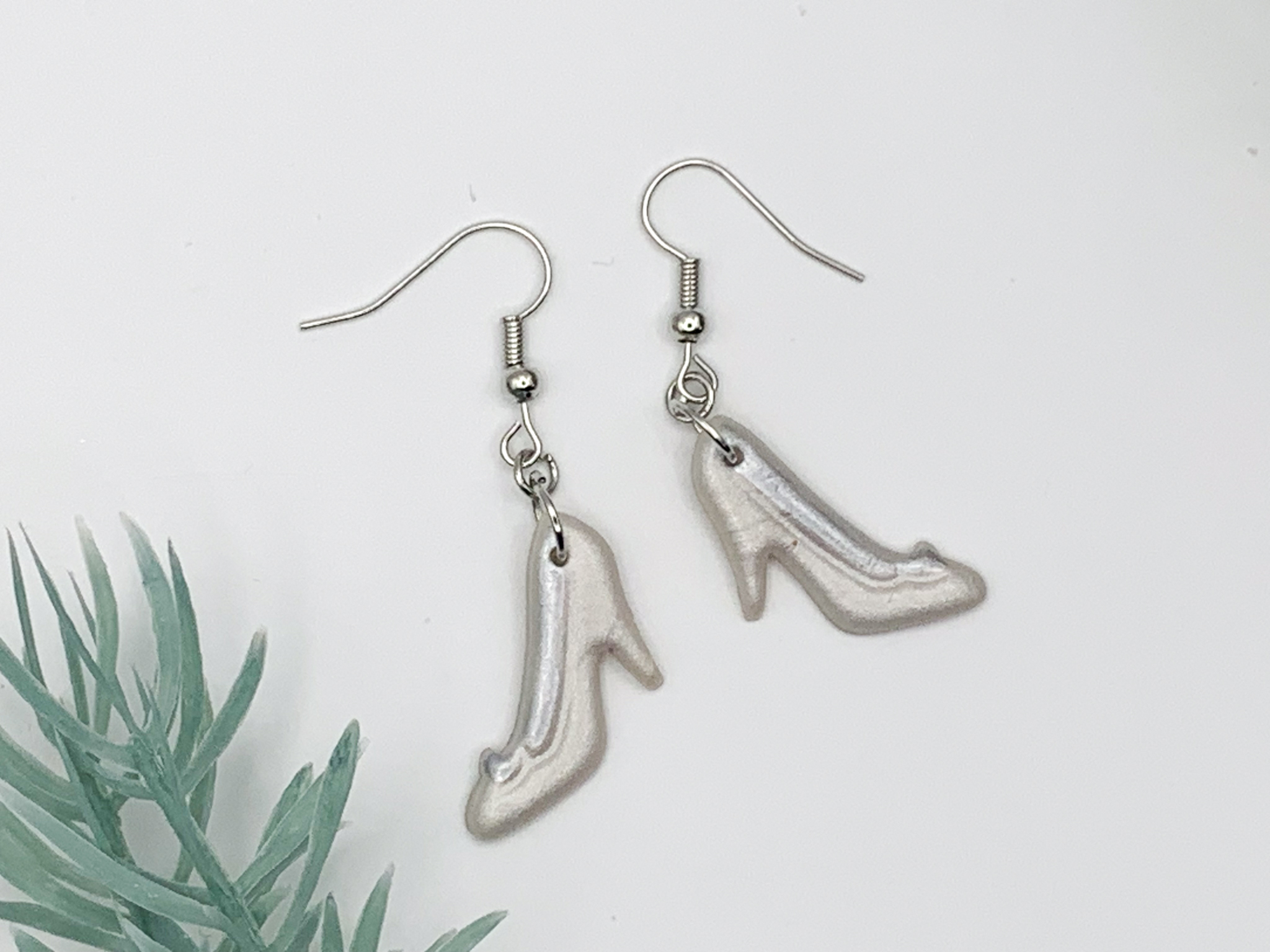 Step into style! These shimmering silver high-heel earrings are perfect for adding a touch of elegance and fun to any outfit.