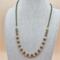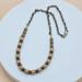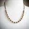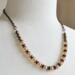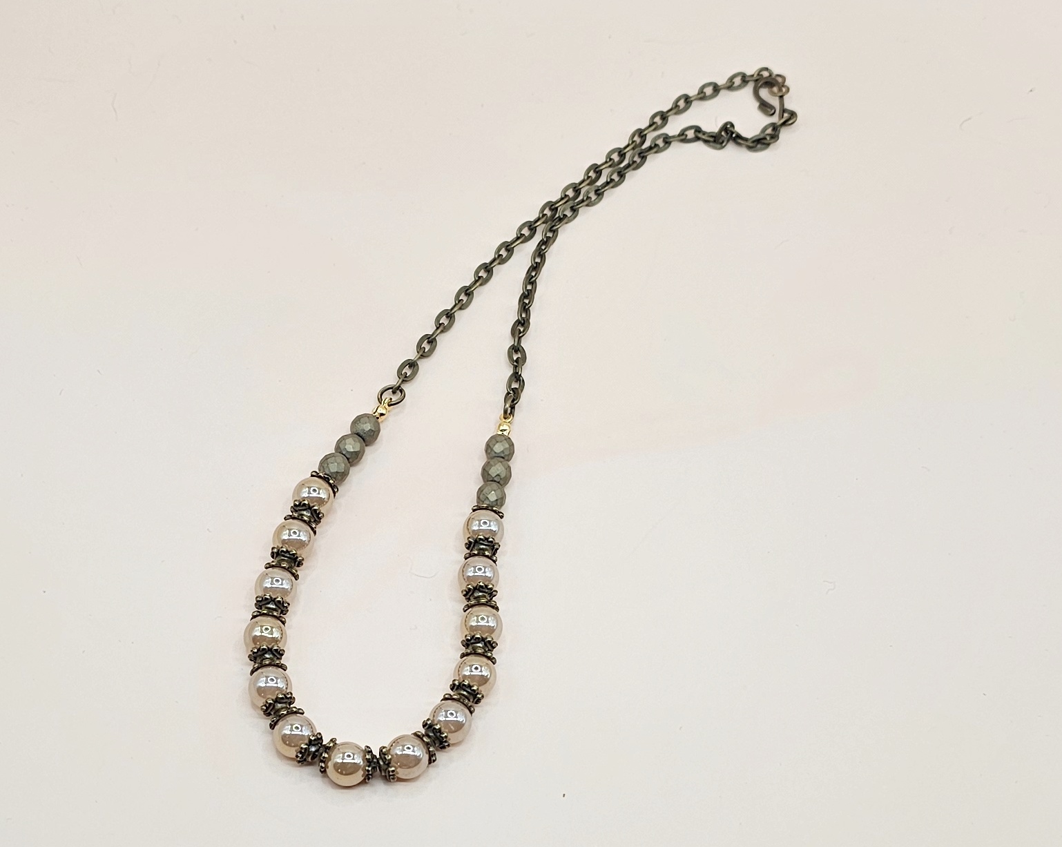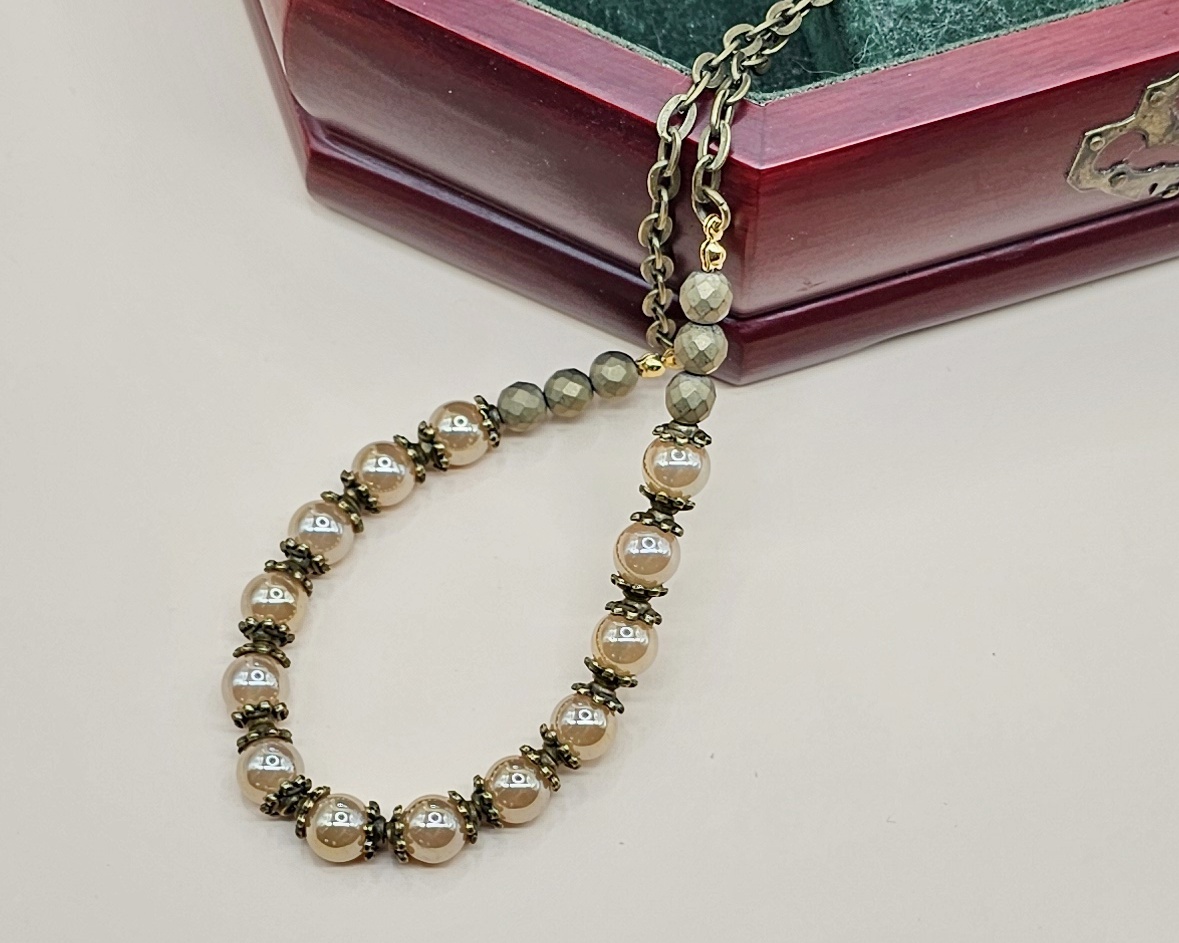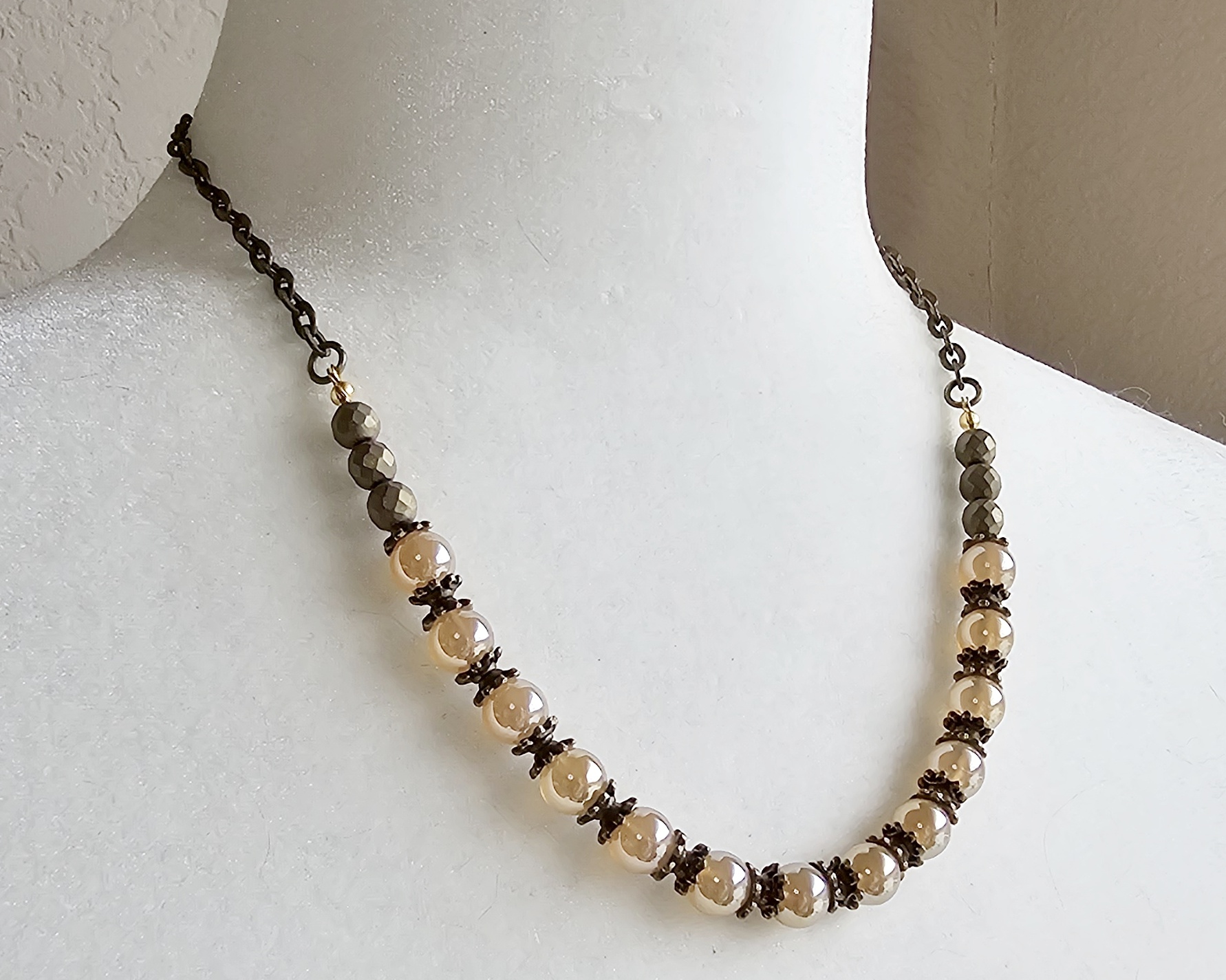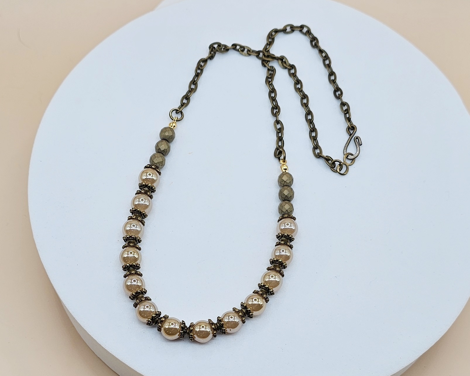 This vintage inspired handmade necklace features antiqued brass chain combined with a central strand of glazed agate beads, brass accents, and hematite. The peach tones add softness and warmth, while the textured hematite introduces subtle contrast and structure. Antiqued brass accents frame each bead, giving the necklace its vintage finish without feeling heavy or ornate.