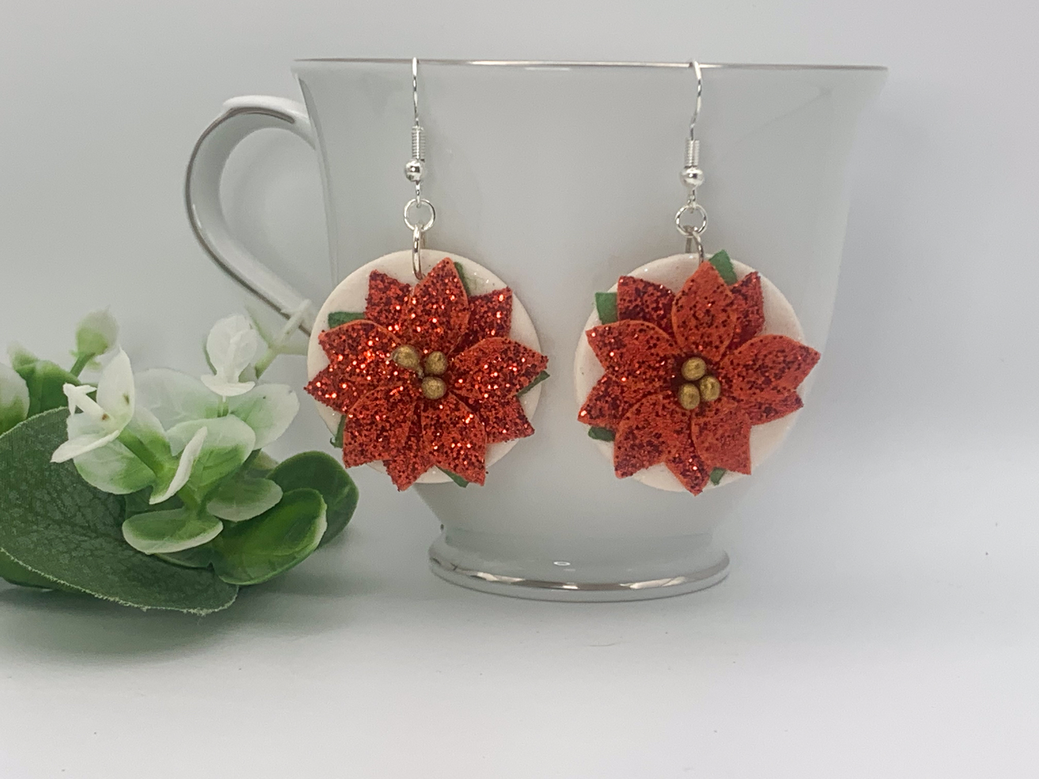 These glittery poinsettia earrings are a showstopper! Bright red petals with golden bead accents make them perfect for holiday glam.