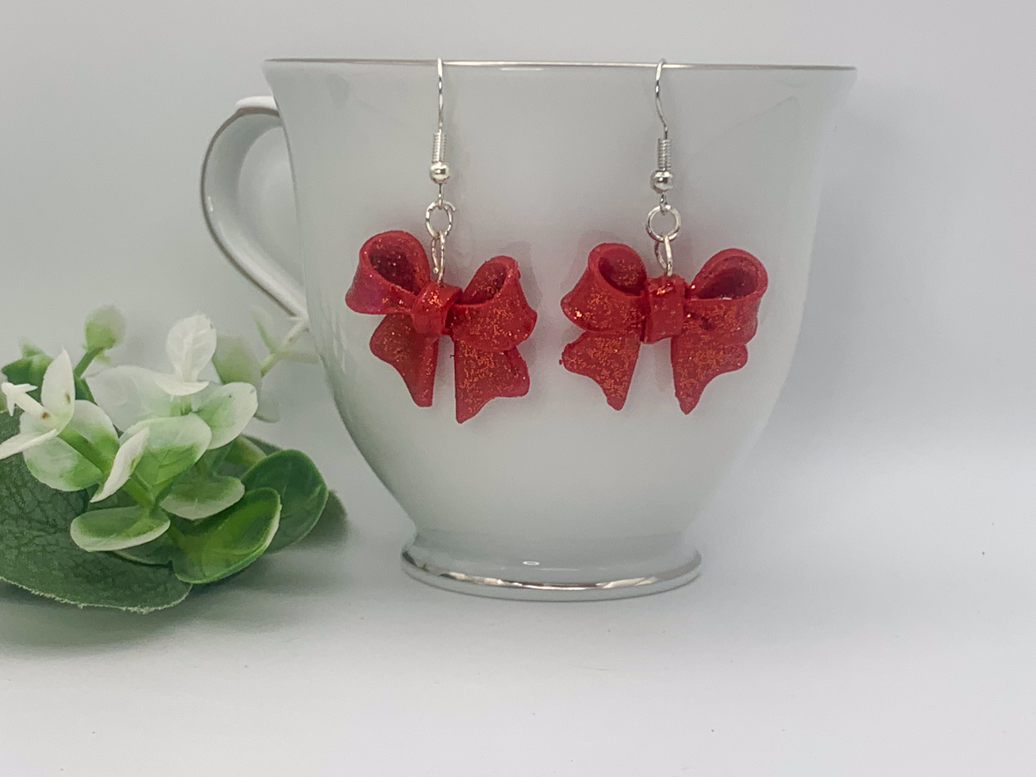 Make your holiday outfits shine with these glittery red bow earrings! Bold, festive, and full of sparkle for the season.