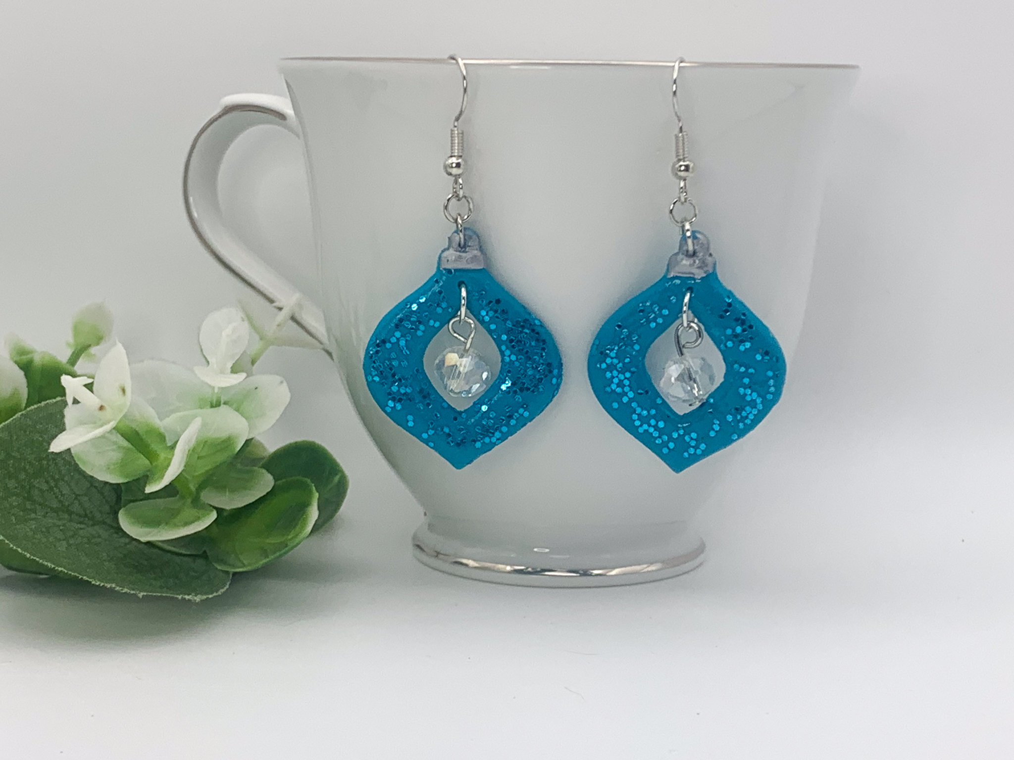These teal glitter ornament earrings feature a sparkling crystal for extra holiday magic! Perfect for anyone who loves festive glam.