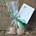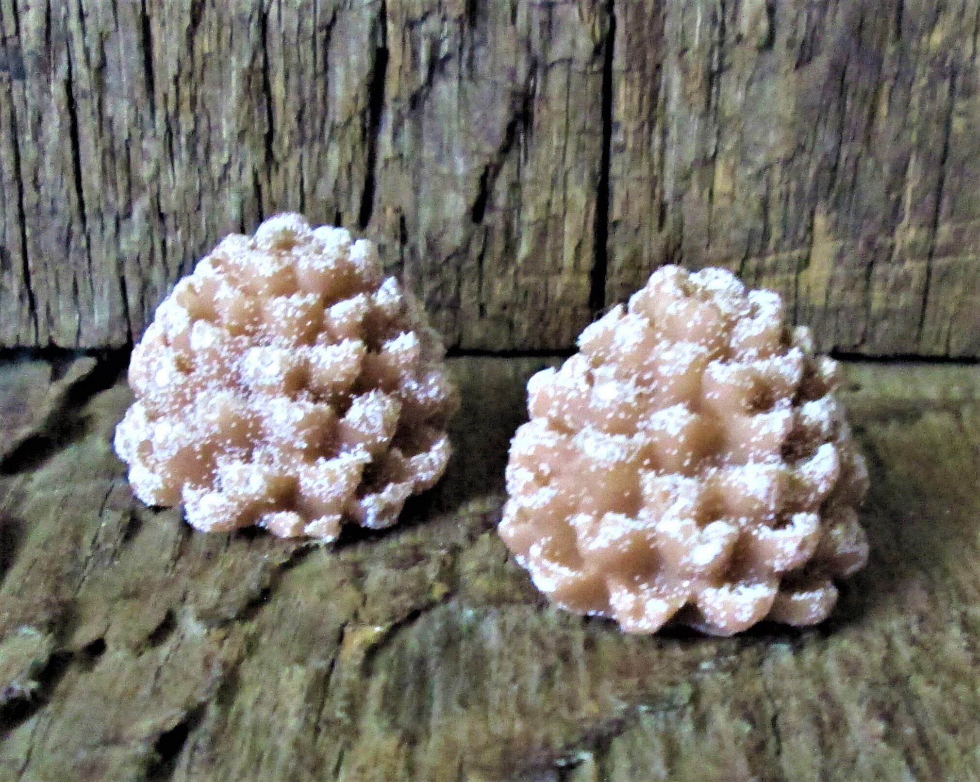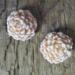 Two tiny snow glitter covered pine cones make great Holiday party favors, birthdays, guest soaps. Each little pine cone has a covering of cosmetic grade glitter to add the sparkle of new fallen snow. Pine cones measure 1" tall. 1 1/4" wide and weigh .4 oz. Two pine cones are packed in a clear cellophane gift bag with a ribbon color of your choice and a personalized gift tag.