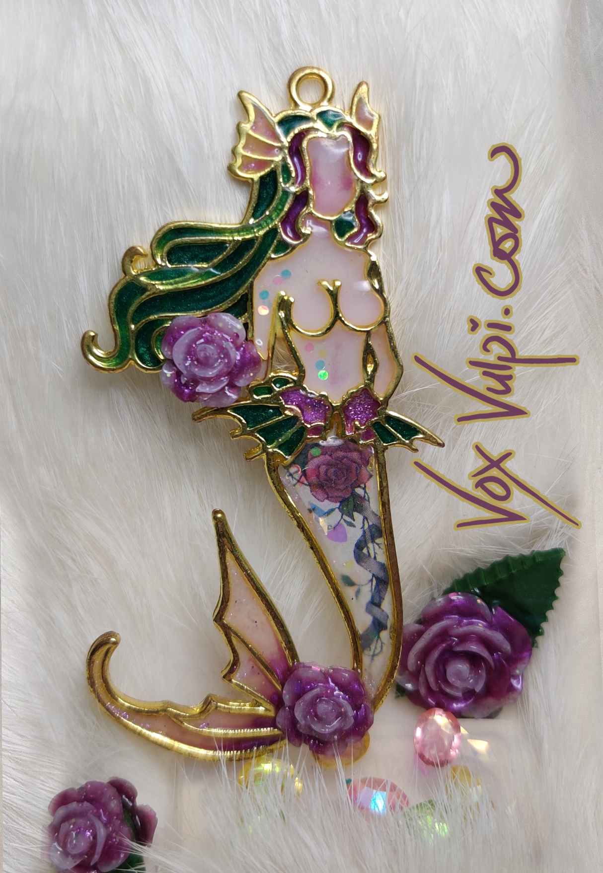 This beautiful rose mermaid will bloom her brightest for you. She boasts a glittering rose detailed tail and 3 dimensional floral details.