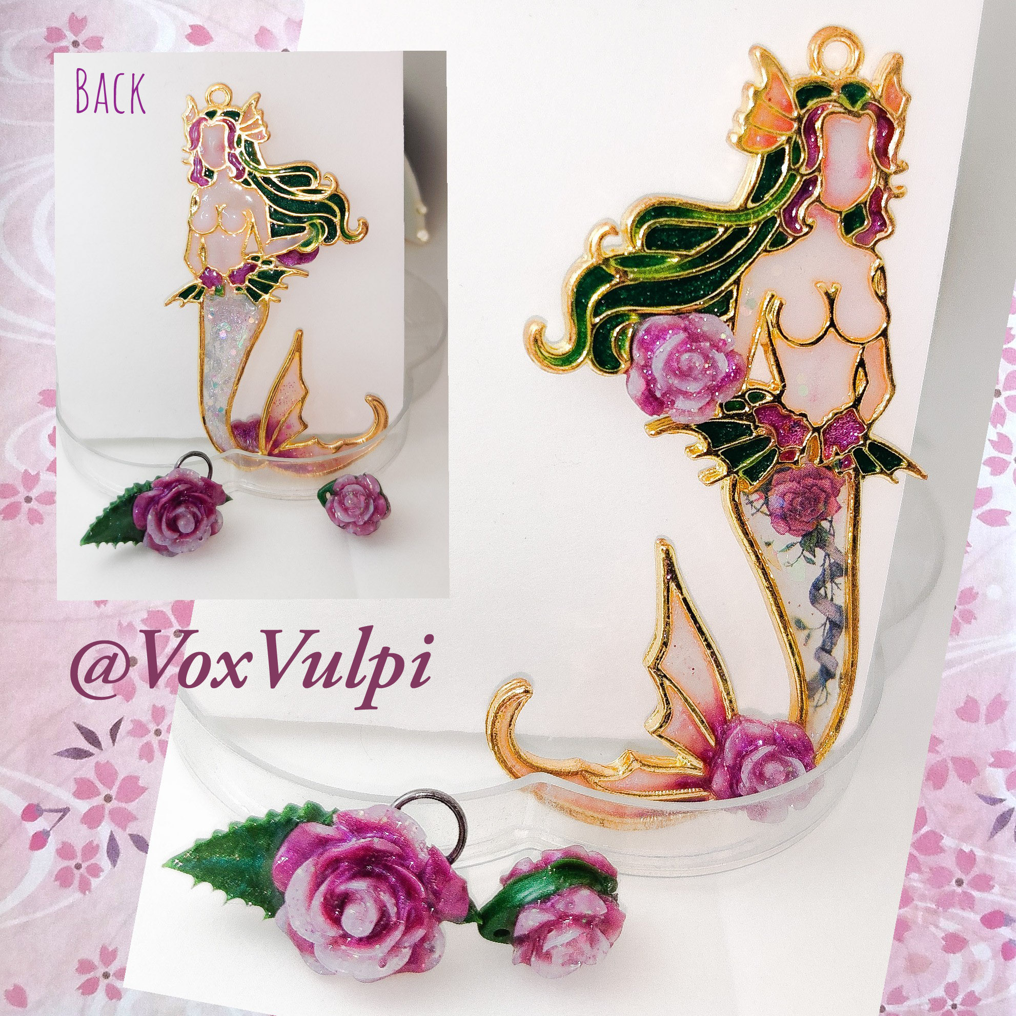This mermaid is made from a combination of elements made with a silicone mold, a pre-made bezel and a piece of washi tape. For the skin and tail tones I used a soft wet on wet resin technique. After the resin colors are laid down I go over them with clear resin on both sides to add finish and volume. The roses and leaves are hand poured into silicone molds. The glitter here is poured in with the occasional piece moved or added by hand.