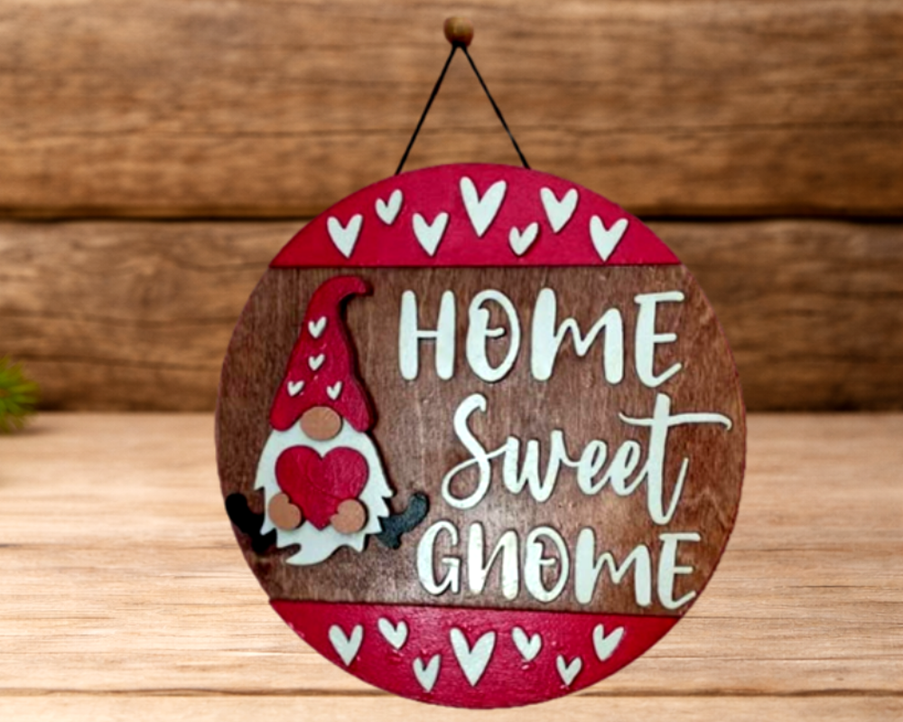 Add a touch of whimsy to your home decor with our Laser Cut Wooden Gnome Wall Hanging. Featuring the phrase "Home Sweet Gnome" and a cute gnome holding a heart, this charming piece is the perfect Valentine's Day accent. Measuring 10 inches in diameter, it is expertly laser cut for precise and intricate detailing. The colors may vary, giving it a unique charm. Perfect for hanging in your living room, kitchen, or even your office, this wall hanging is sure to bring cheer to your space. High-quality craftsmanship ensures it will become a beloved addition to your home decor.