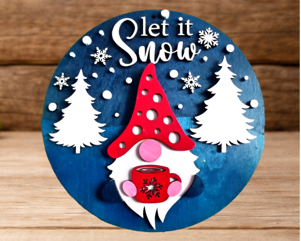 Our Laser Cut Wooden Gnome Wall Hanging is the perfect addition to any holiday or coffee-themed home decor. This charming piece features the phrase "Let it Snow" and a cute gnome enjoying a cup of coffee. It is laser cut for precise and intricate detailing and measures 10 inches in diameter. The colors of the wall hanging may vary, adding to its unique charm. Hang this wall hanging in your living room, kitchen, or even your office to bring a bit of whimsy and cheer to your space. With its beautiful design and high-quality craftsmanship, this wall hanging is sure to become a favorite in your home.