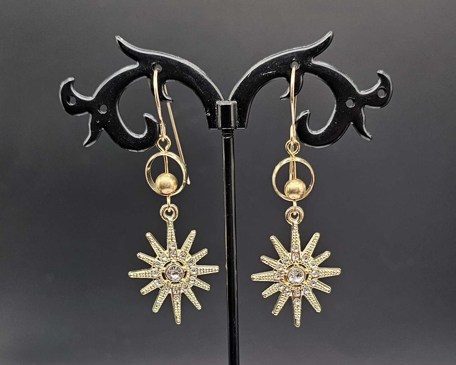 Illuminate your wardrobe with these handmade celestial starburst earrings,designed to bring a little lightness, sparkle, and fun to your day. At 2.5 inches long, they’re the perfect mix of statement and elegance—glam enough for a night out, yet easy enough to add a little magic to your everyday look. Each earring features a radiant gold-plated star accented with sparkling rhinestones, a stainless steel circle and bead, and handcrafted 14k gold-filled earring wires, each as unique as the stars in the sky.