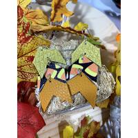 Stunning statement earrings made from lightweight genuine leather. Top circle is a turquoise and gold birch bark pattern and large bottom circle is a shiny gold leather. Ear wires are gold filled. Total length is 3.5 inches. These earrings are perfect for evening wear or a daytime touch of sparkle!