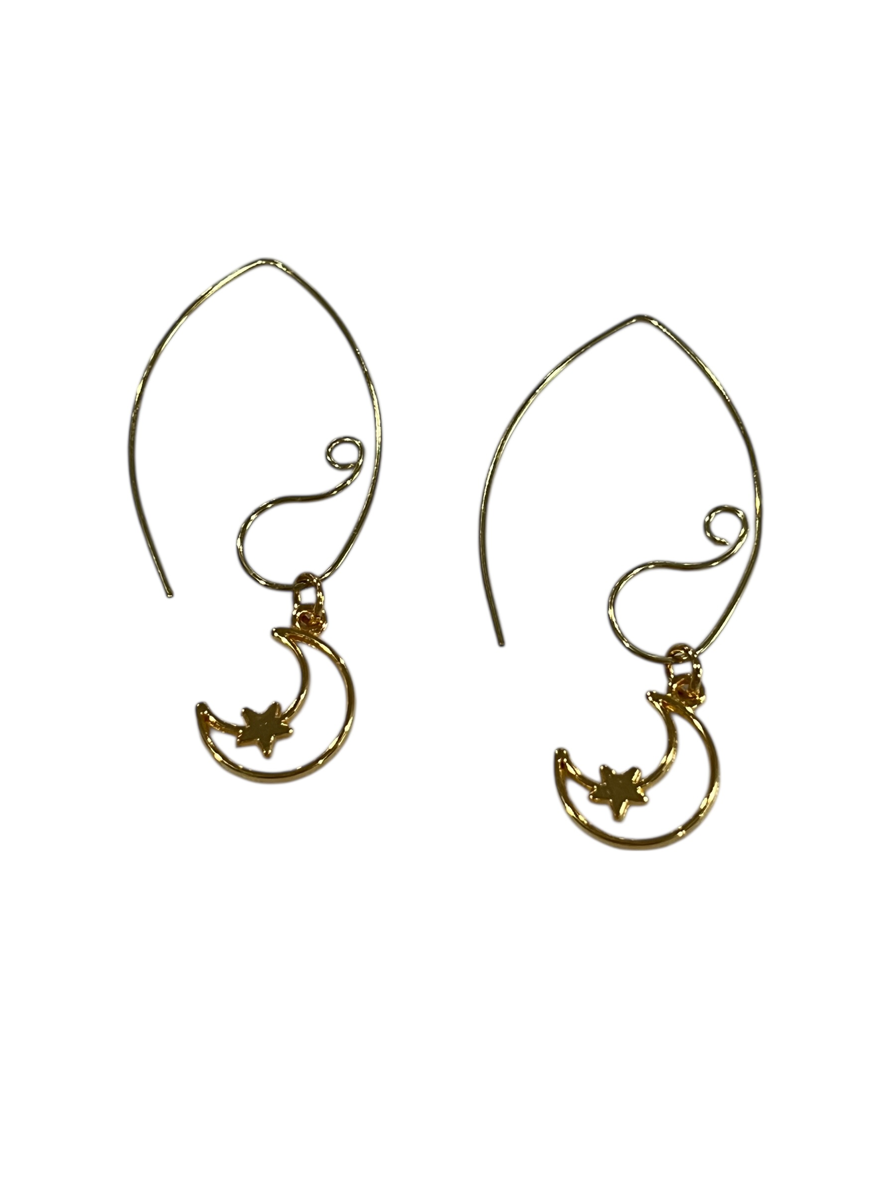 Dangle earrings with 18k gold plated stainless steel half moon and star and a unique long hook ear wire. Length when wearing is 2" long. Flattering and fun to wear. Lightweight.