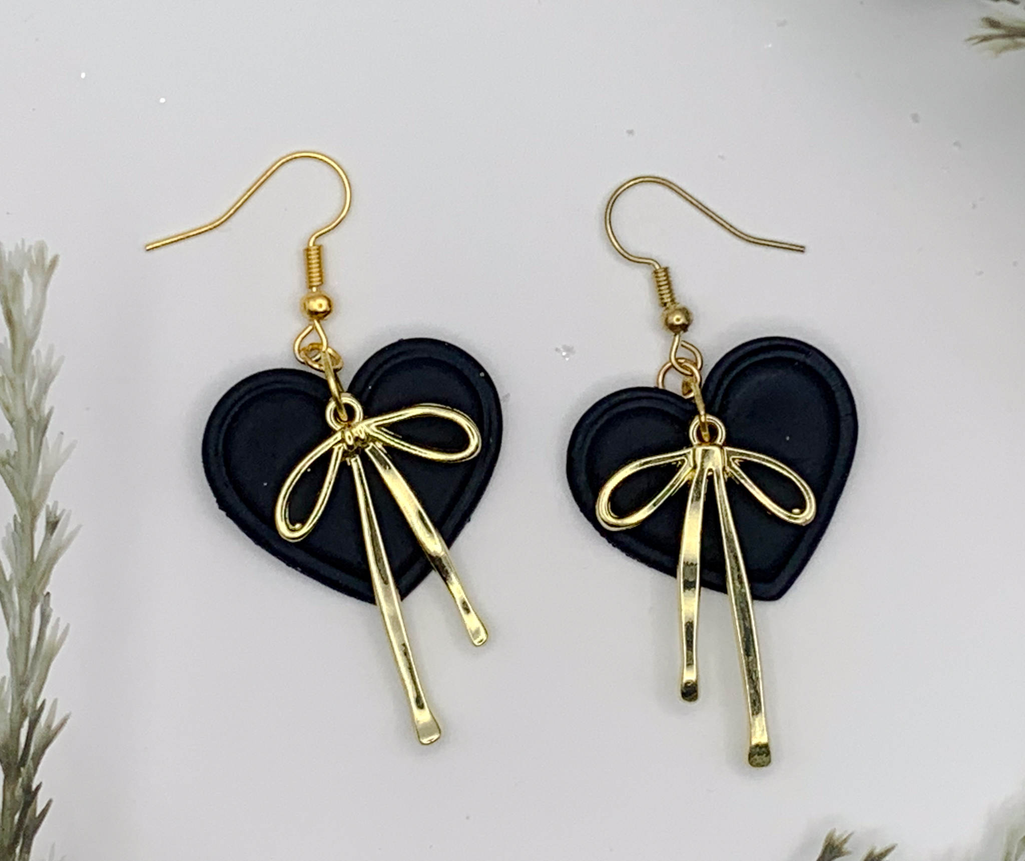 Sweet meets sophisticated! These black polymer clay hearts are adorned with elegant golden bow charms for a playful yet classy vibe. They’re lightweight and full of personality—perfect for gifting or treating yourself!